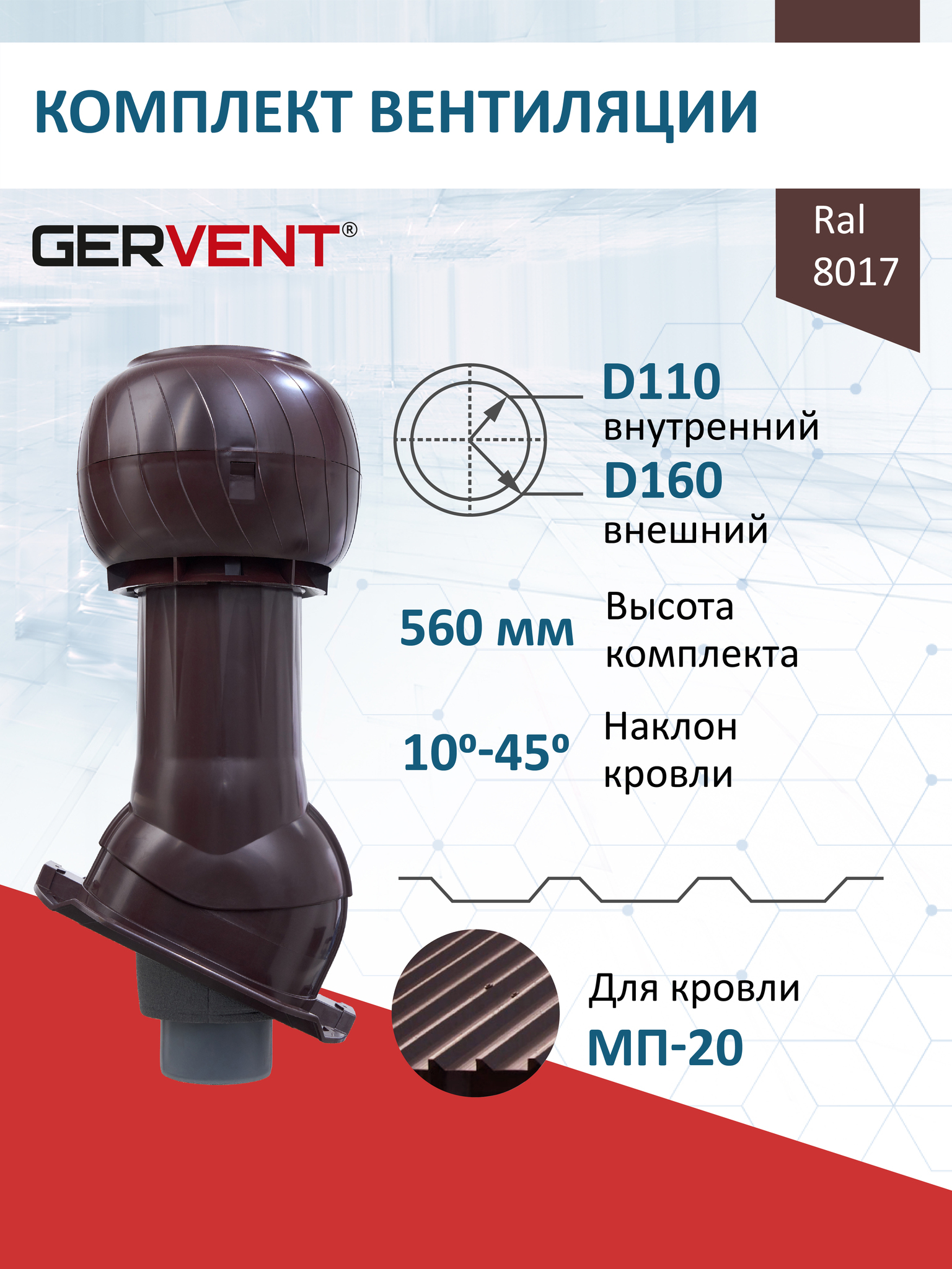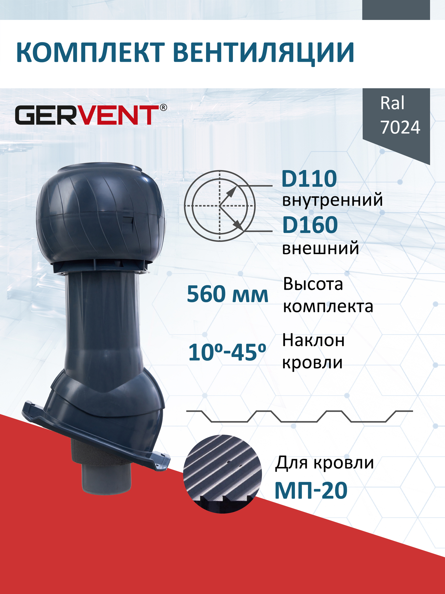 Вентиляционный выход изолированный D110/160 H=500 - 1 шт; Проходной элемент для кровли из металлопрофиля МП-20 (С20)- 1 шт; Колпак вентиляционный D160 - 1 шт.