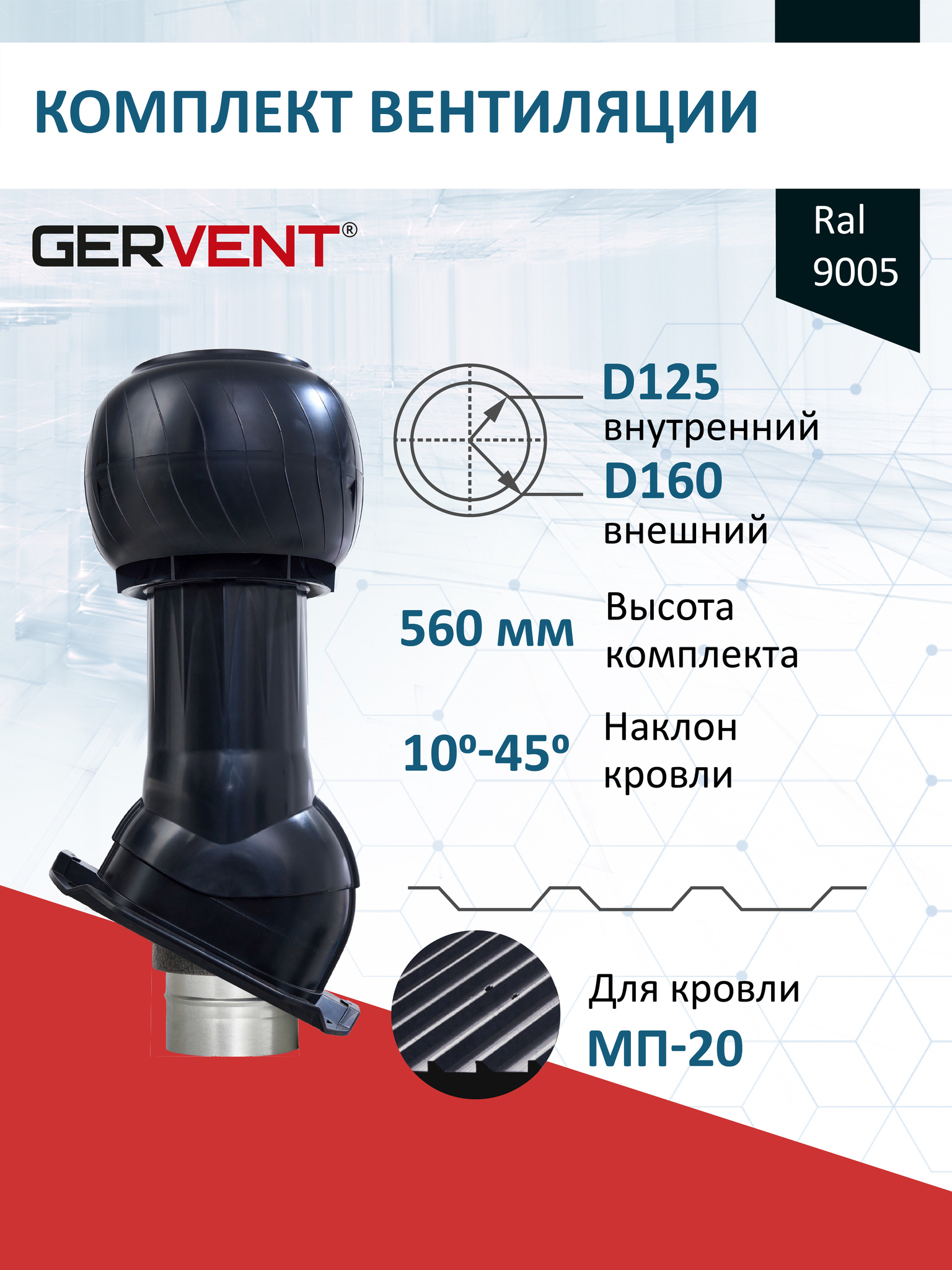 Вентиляционный выход изолированный D125/160 H=500 - 1 шт; Проходной элемент для кровли из металлопрофиля МП-20 (С20)- 1 шт; Колпак вентиляционный D160 - 1 шт.