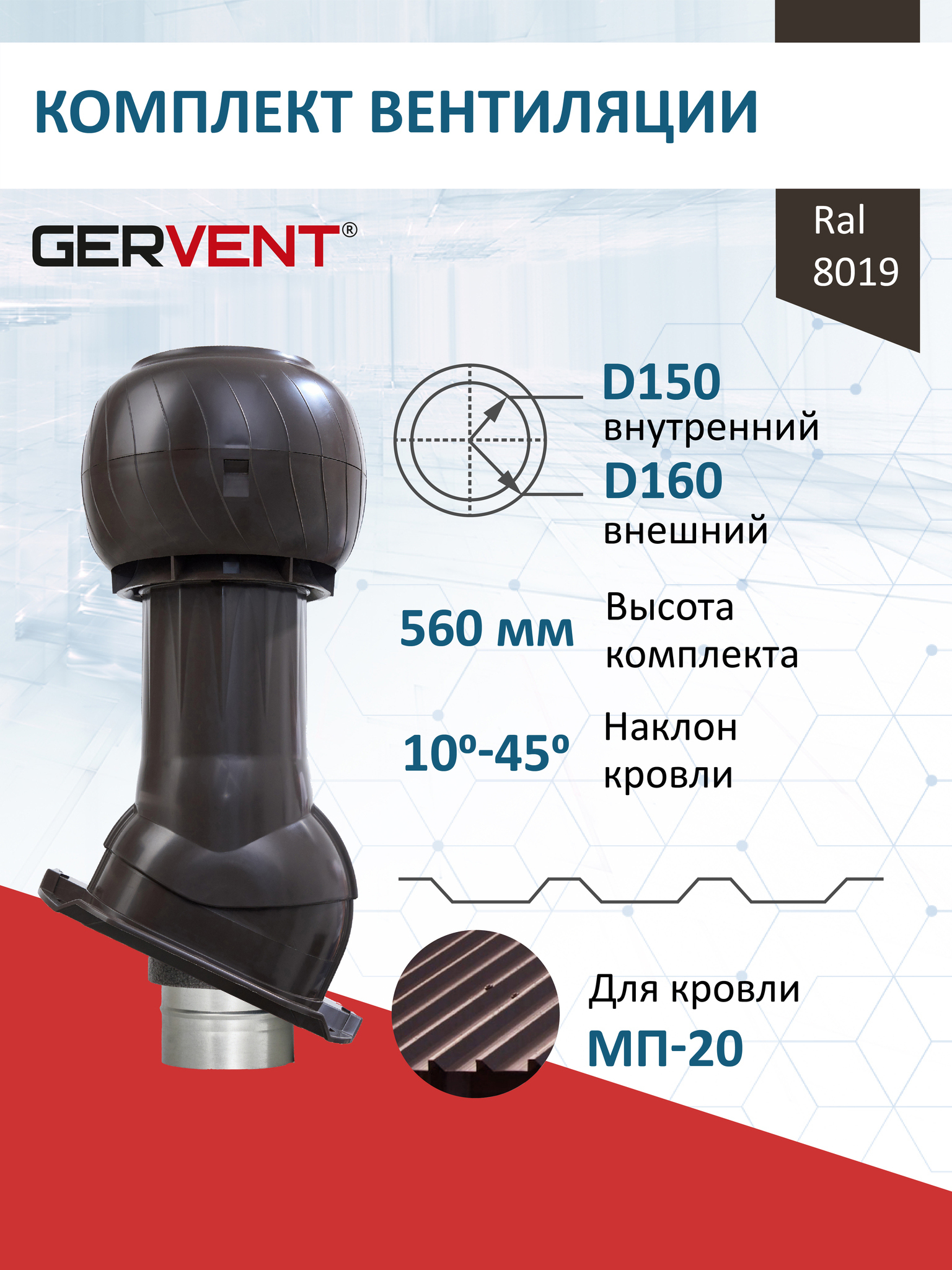 Комплект вентиляции Gervent: Колпак вентиляционный D160, вент. выход утепленный высотой Н-500, для кровельного профнастила 20 мм  - служит для создания вытяжки в вентиляционном канале частного или многоквартирного дома, в погребе, гараже, предбаннике, в парилке бани, внешней вентиляции септика и складских помещениях. Эффективно работает под воздействием ветра, обеспечивая активную циркуляцию воздуха в кровельном или подкровельном пространстве. В комплект входит колпак вентиляционный 160 мм, вентиляционный выход изолированный и проходной элемент для кровли из металлопрофиля МП-20 (С20). Все элементы выполнены из качественного ABS пластика (полипропилена), прокрашенного в массе.