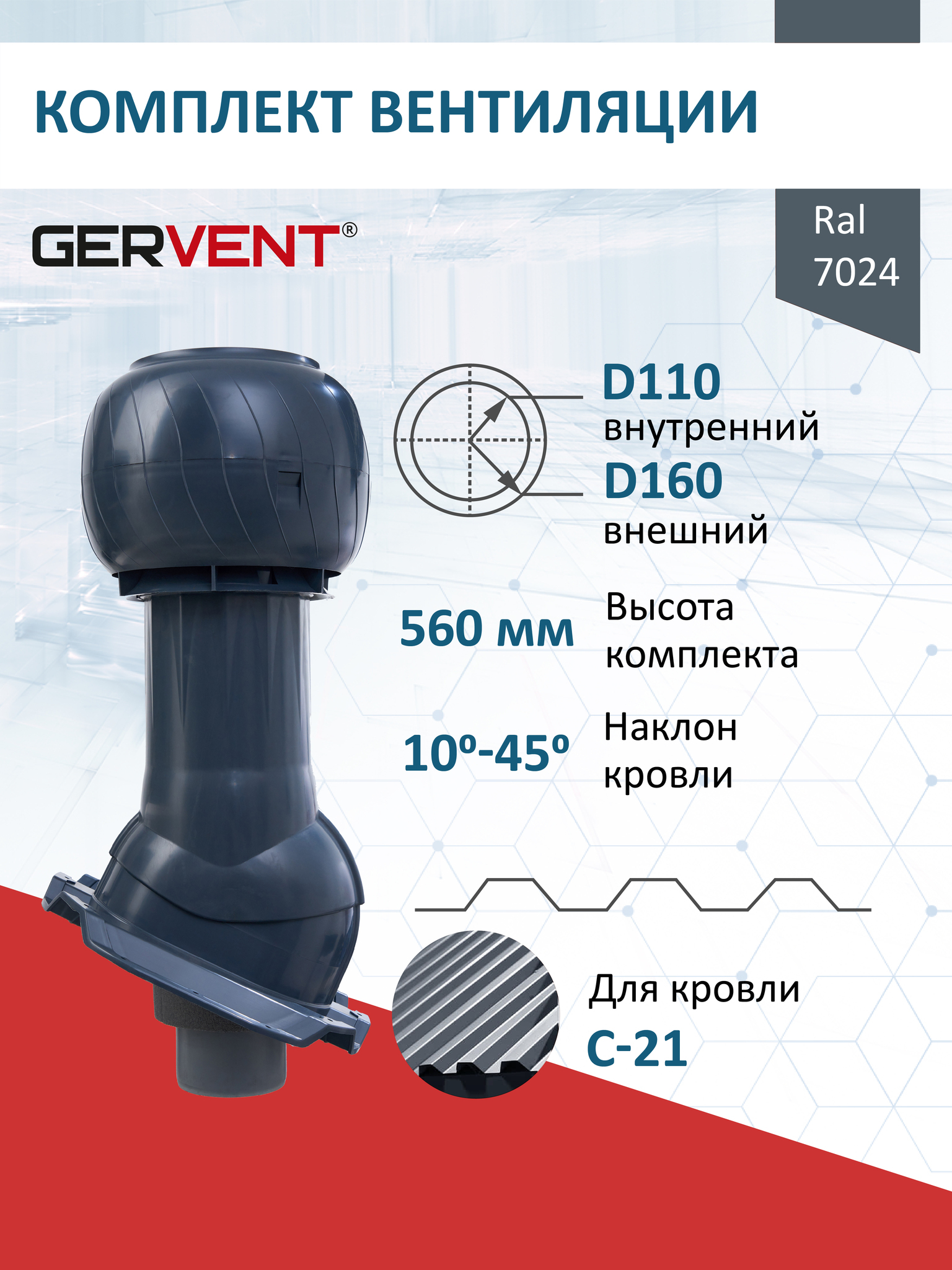 Вентиляционный выход изолированный D110/160 H=500 - 1 шт; Проходной элемент для профильного листа С21 - 1 шт; Колпак вентиляционный D160 - 1 шт.