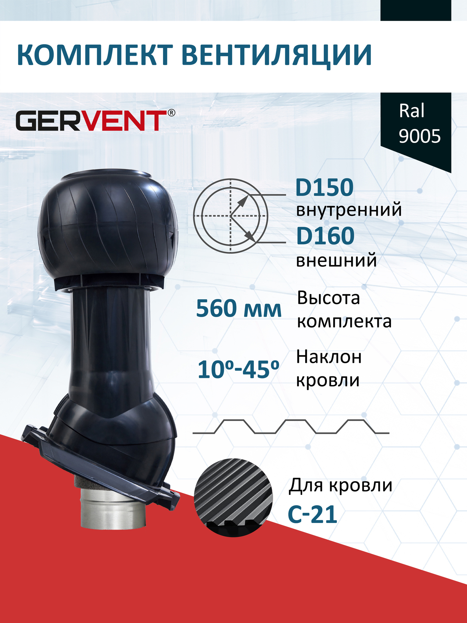Комплект вентиляции Gervent: Колпак вентиляционный D160, вент. выход утепленный высотой Н-500, для кровельного профнастила С-21 мм - служит для создания вытяжки в вентиляционном канале частного или многоквартирного дома, в погребе, гараже, предбаннике, в парилке бани, внешней вентиляции септика и складских помещениях. Эффективно работает под воздействием ветра, обеспечивая активную циркуляцию воздуха в кровельном или подкровельном пространстве. В комплект входит колпак вентиляционный 160 мм, вентиляционный выход изолированный и проходной элемент для кровли из металлопрофиля МП-21 (С21). Все элементы выполнены из качественного ABS пластика (полипропилена), прокрашенного в массе.