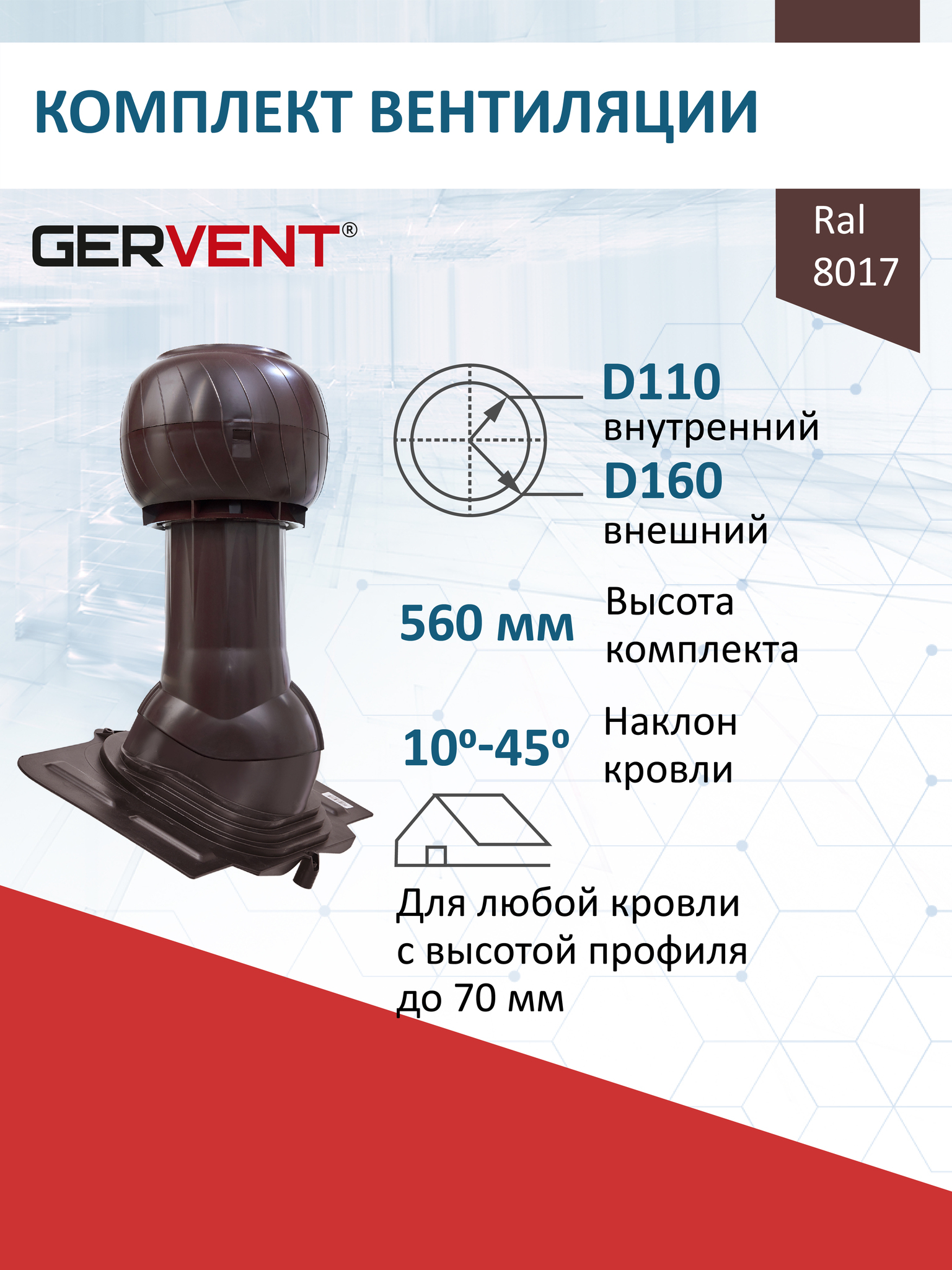 Вентиляционный выход GERVENT является частью вентиляционной системы. Устанавливается через проходной элемент на кровлю. Вентиляционный выход изолированный с внутренней пластиковой трубой 110 мм подходит для кровель с уклоном от 10° до 45°. Внешняя и внутренняя труба разделены утеплителем, который обеспечивает теплоизоляцию, препятствует обмерзанию трубы во время морозов и минимизирует образование конденсата.