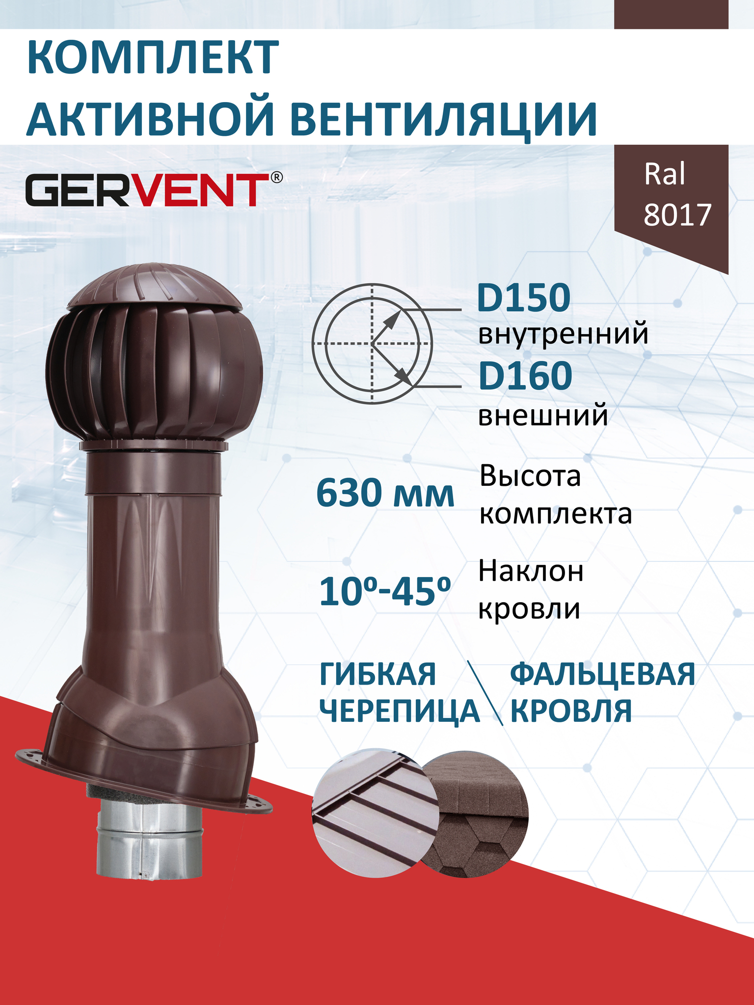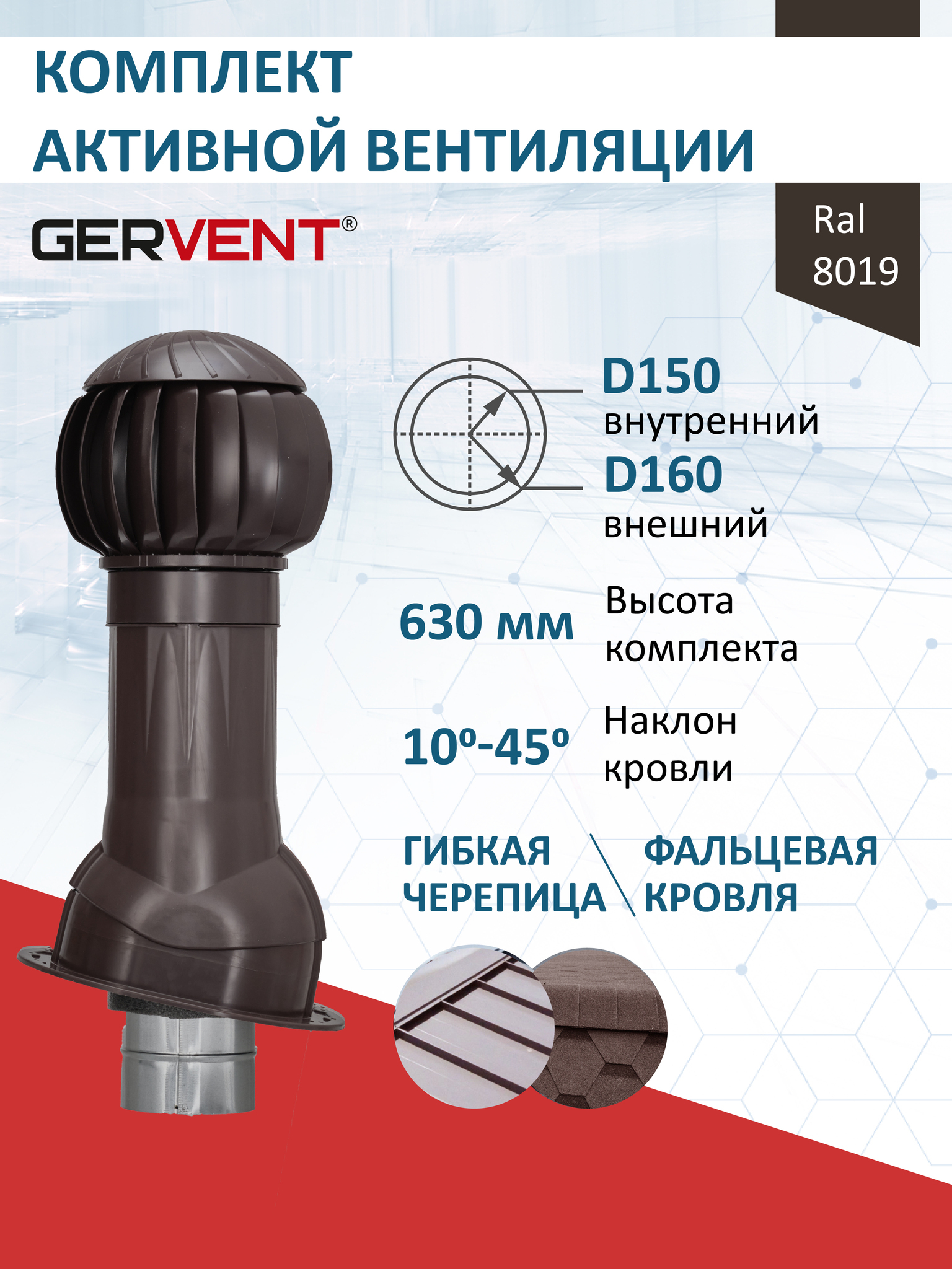 В комплект входит ротационная вентиляционная турбина 160 мм, вентиляционный выход изолированный и проходной элемент для фальцевой и готовой кровли из битумной черепицы.
