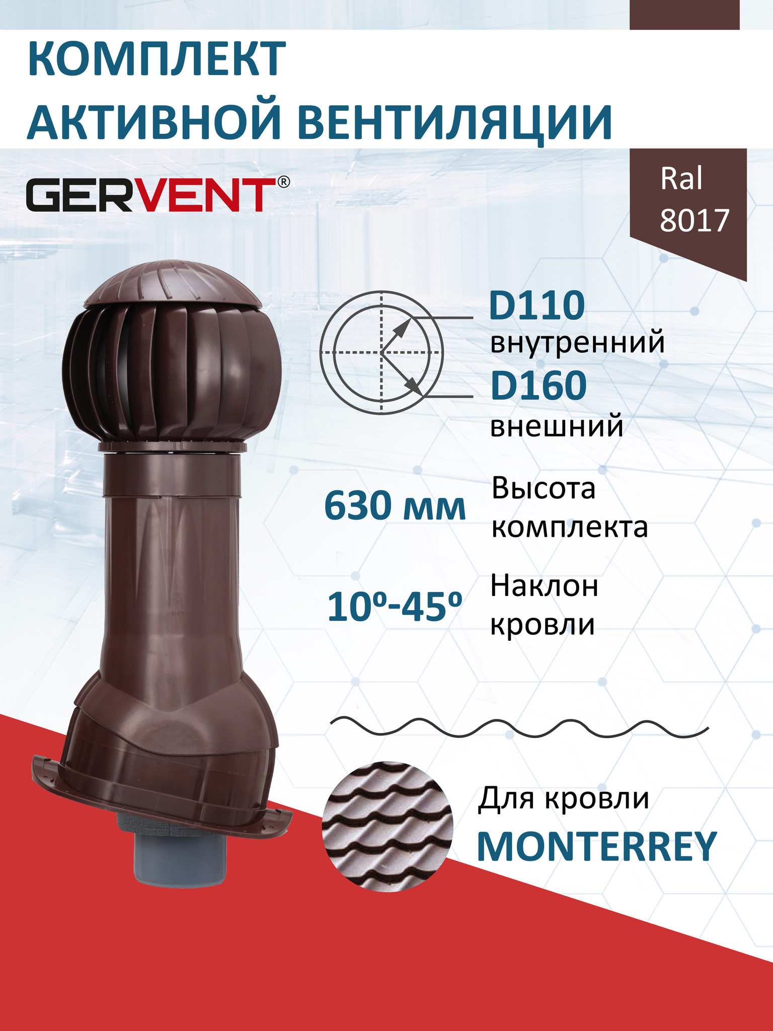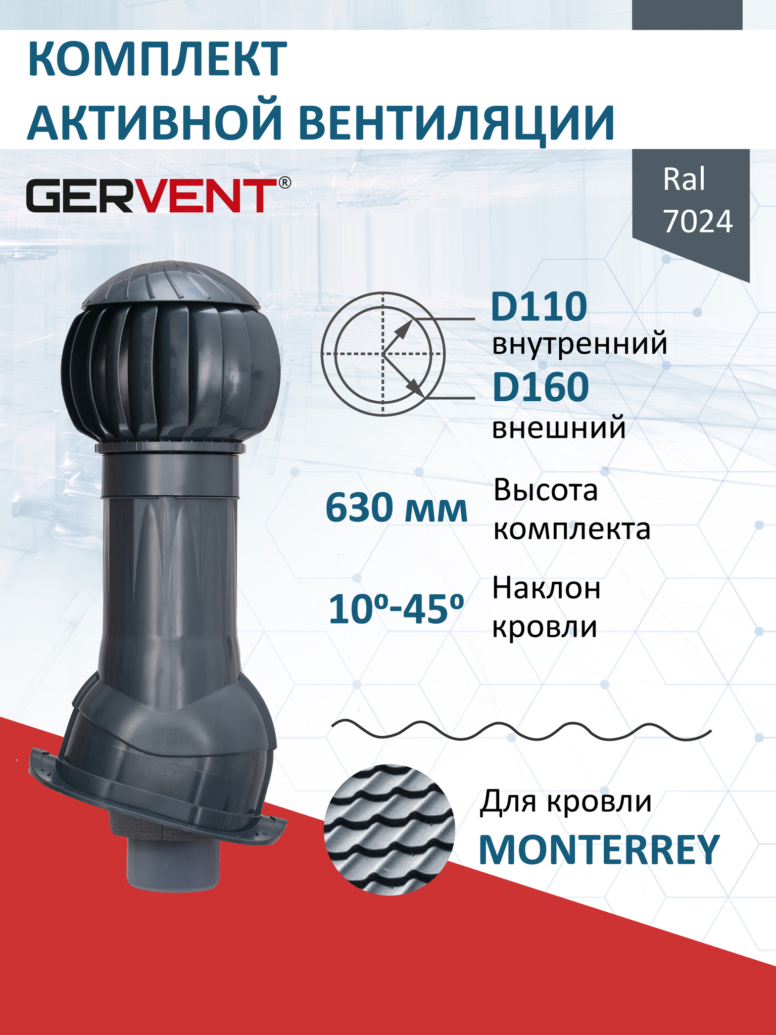 В комплект входит ротационная вентиляционная турбина 160 мм, ввентиляционный выход изолированный 160 мм с внутренней пластиковой трубой 110 мм и проходной элемент для кровли из металлочерепицы Монтеррей (Monterrey).