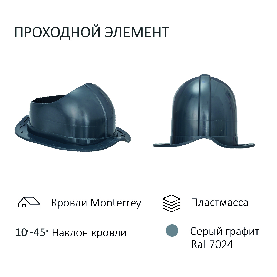 В комплект входит ротационная вентиляционная турбина 160 мм, вентиляционный выход изолированный и проходной элемент для кровли из металлочерепицы Монтеррей (Monterrey).