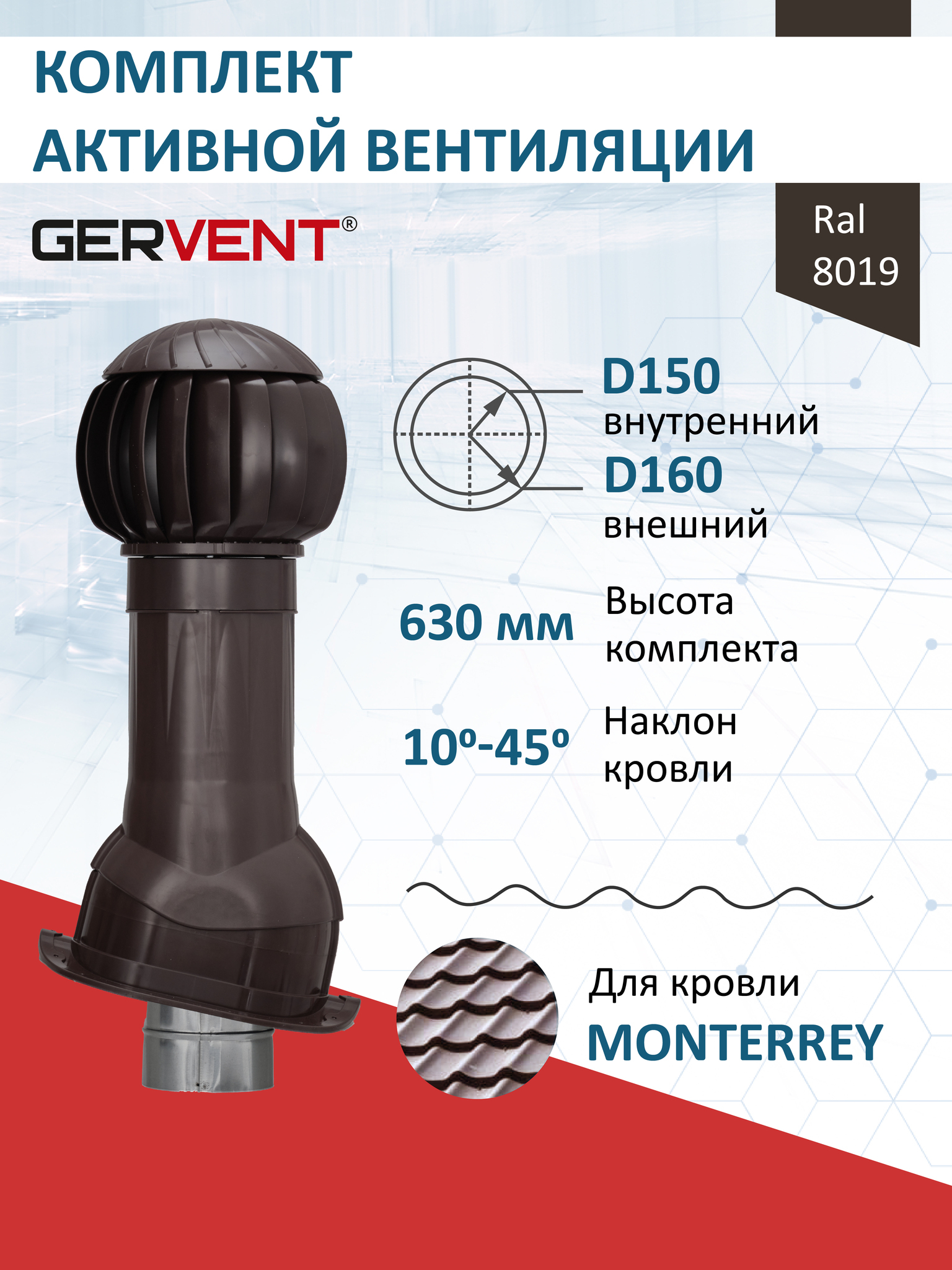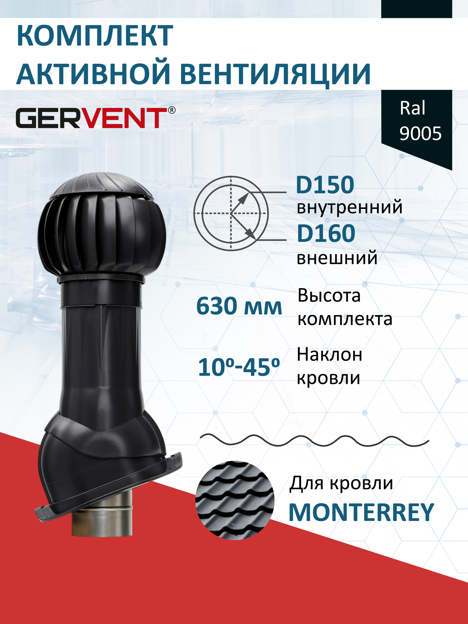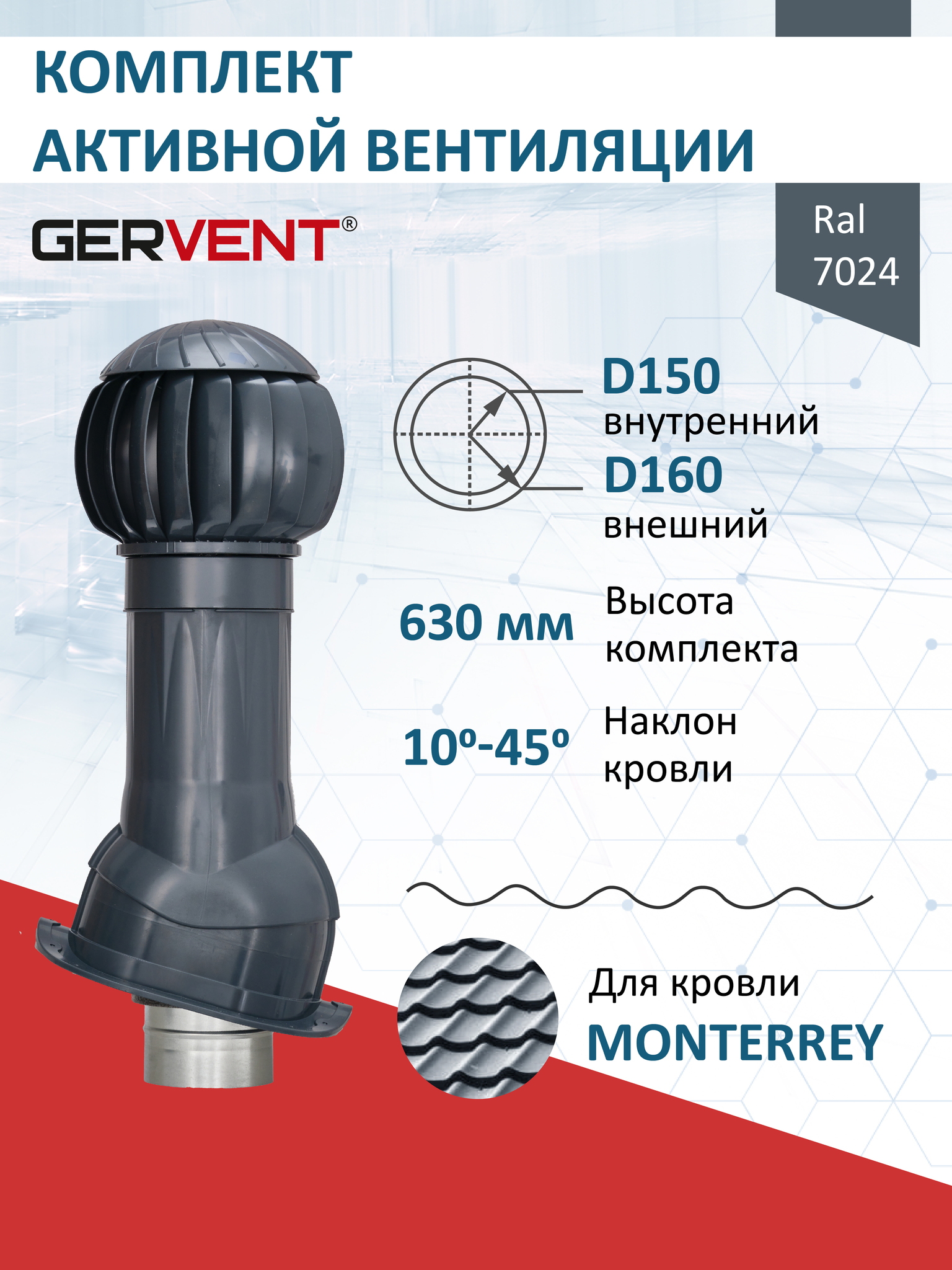 В комплект входит ротационная вентиляционная турбина 160 мм, вентиляционный выход изолированный и проходной элемент для кровли из металлочерепицы Монтеррей (Monterrey).