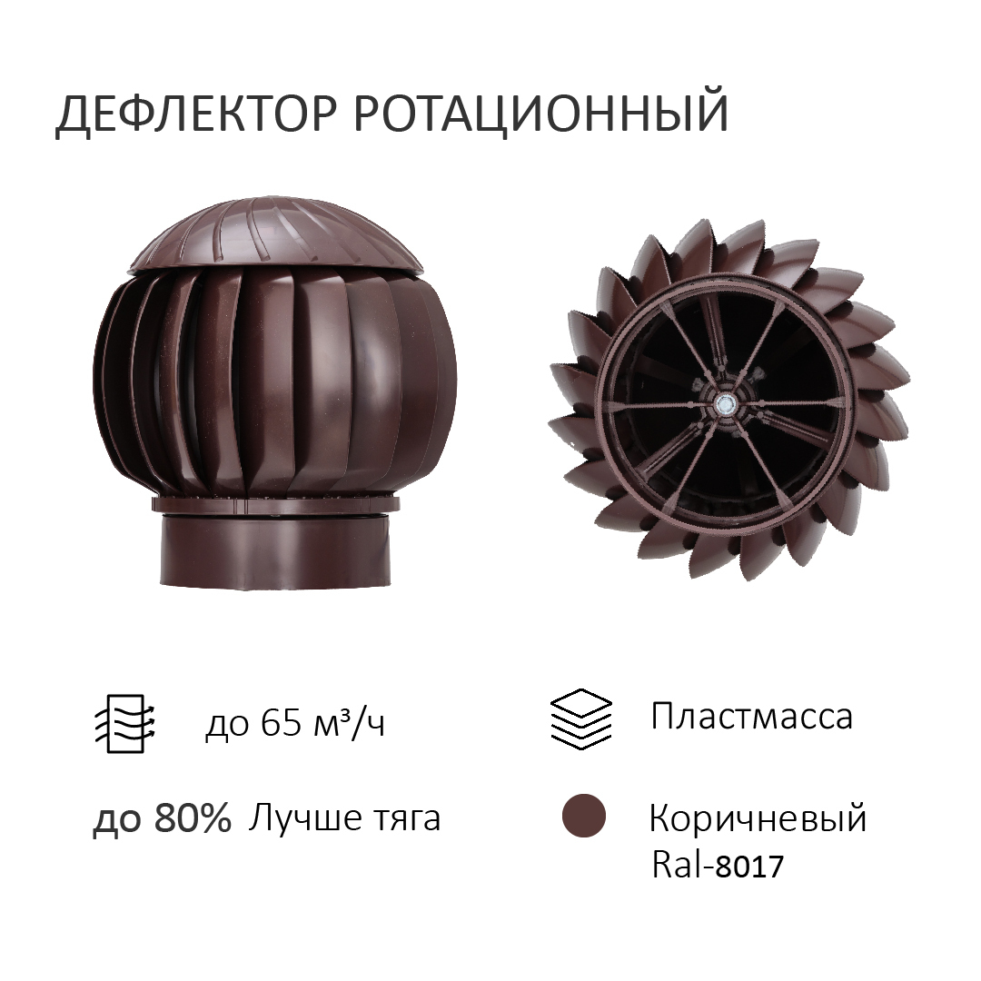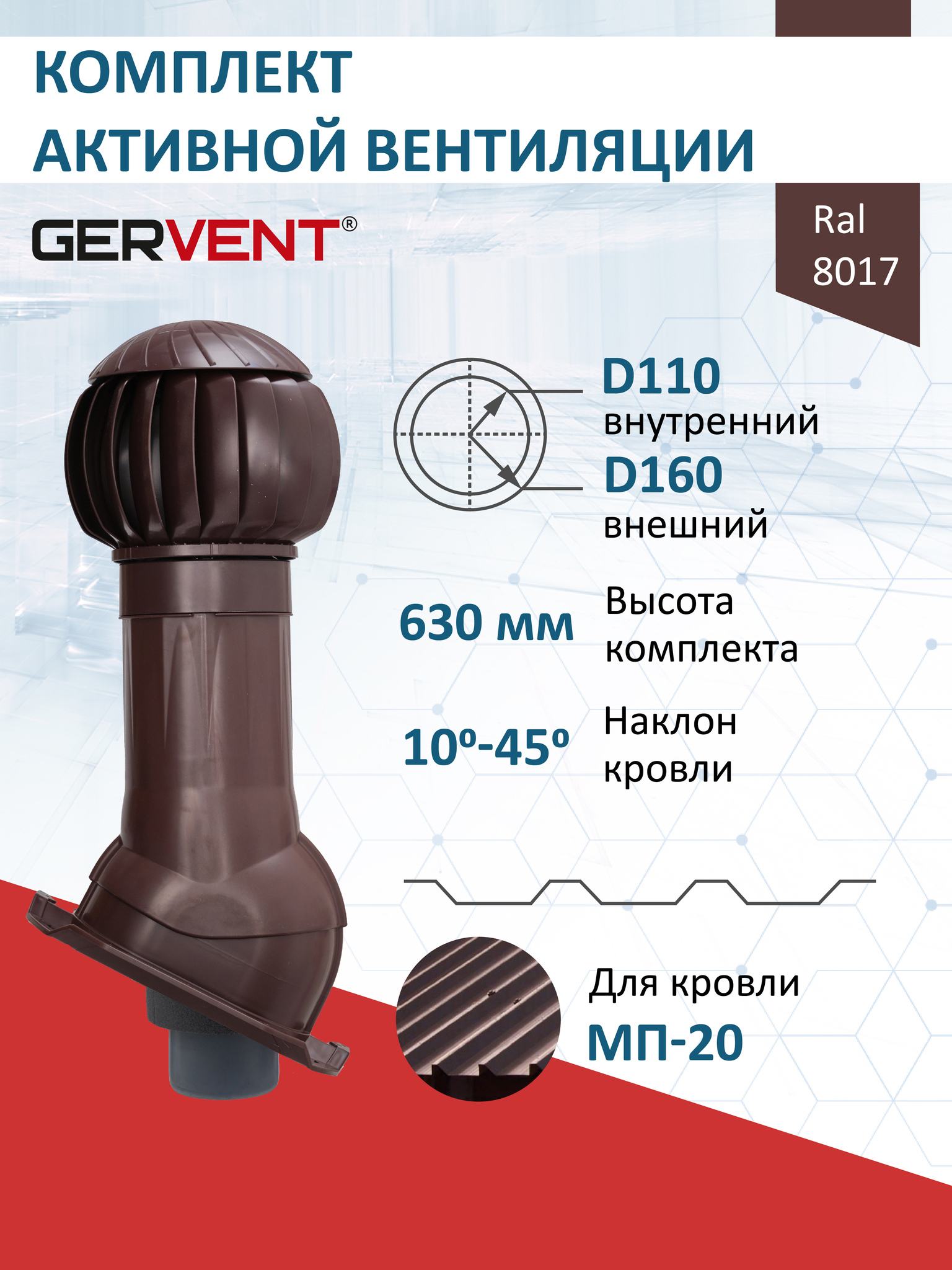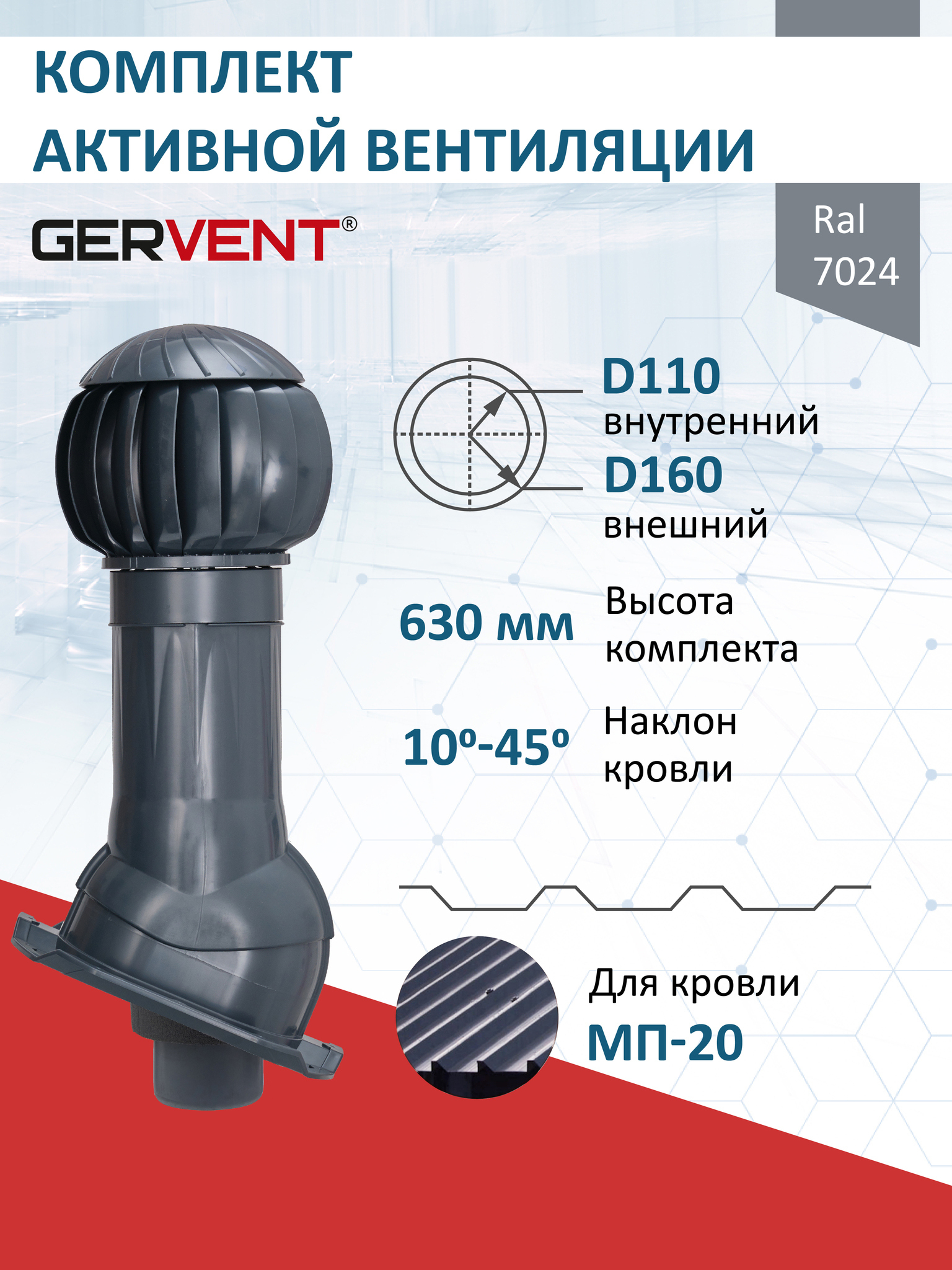 В комплект входит ротационная вентиляционная турбина 160 мм, вентиляционный выход изолированный 160 мм с внутренней пластиковой трубой 110 мм и проходной элемент для кровли из металлопрофиля МП-20 (С20).
