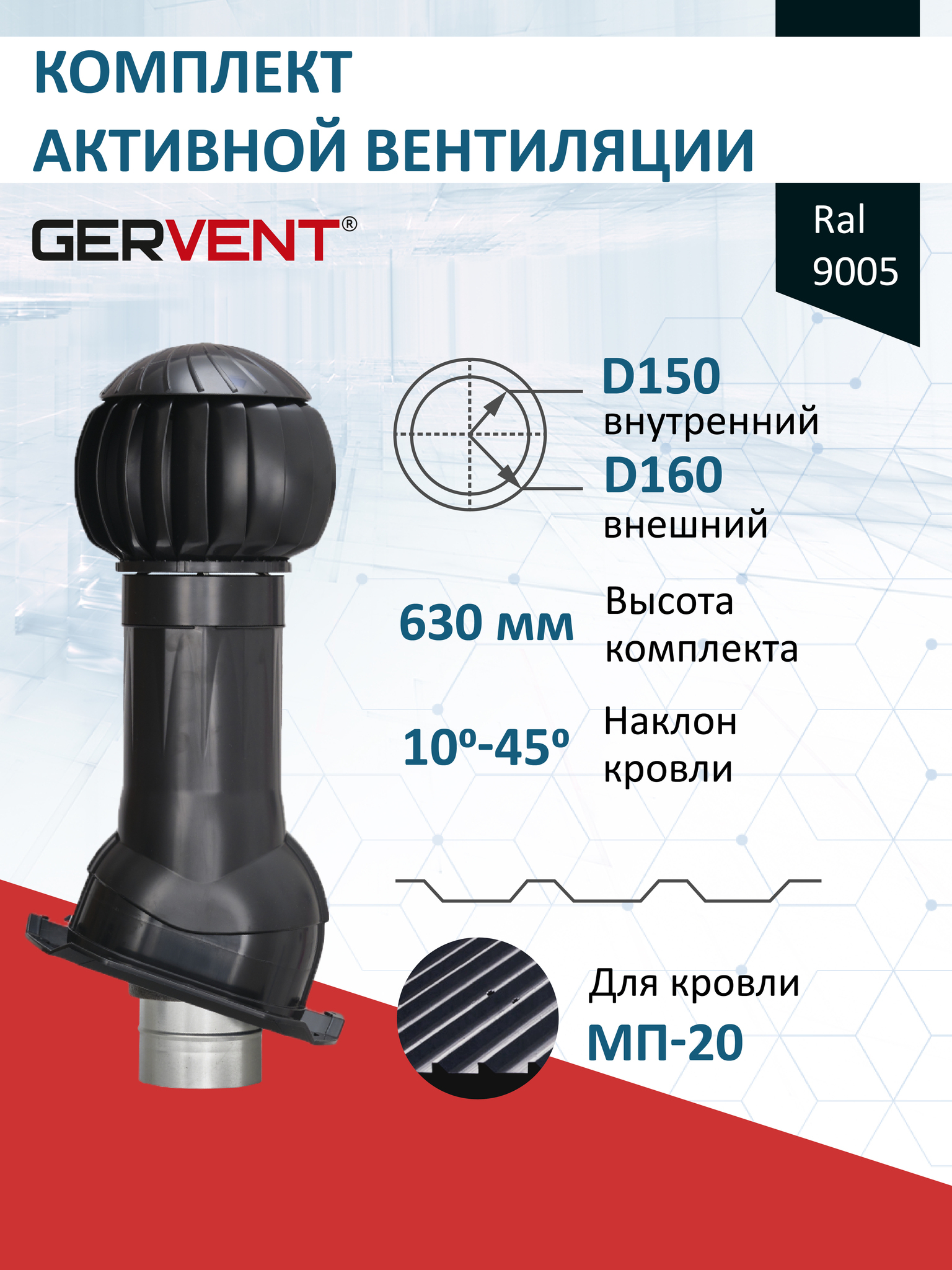 В комплект входит ротационная вентиляционная турбина 160 мм, вентиляционный выход изолированный и проходной элемент для кровли из металлопрофиля МП-20 (С20).