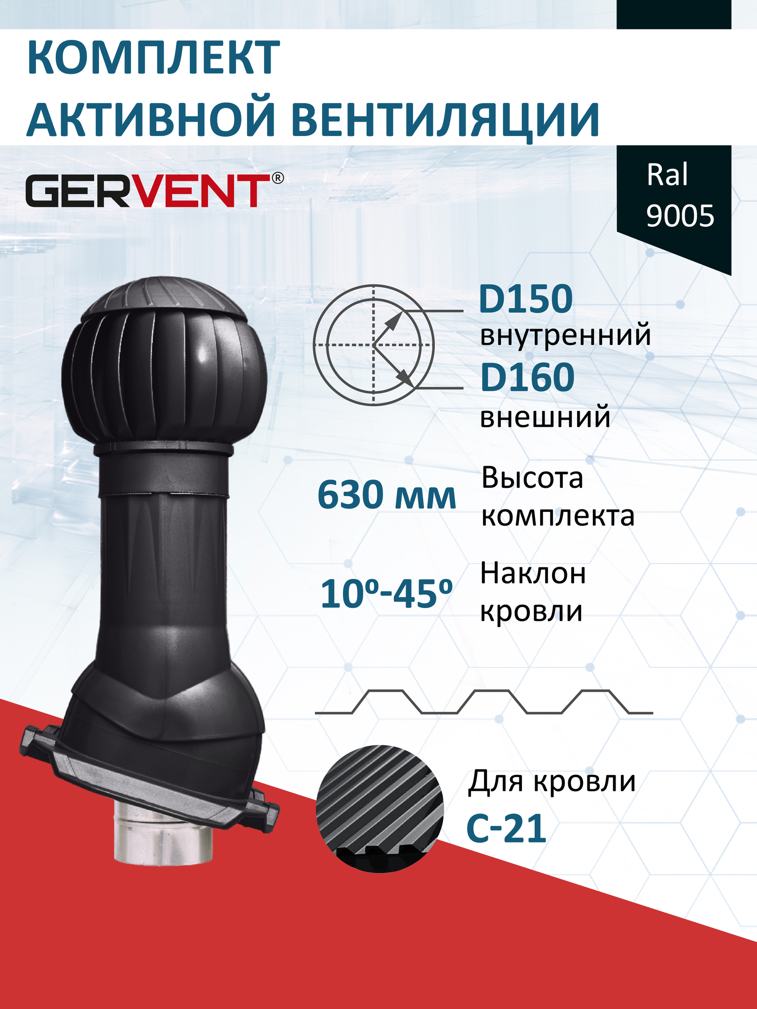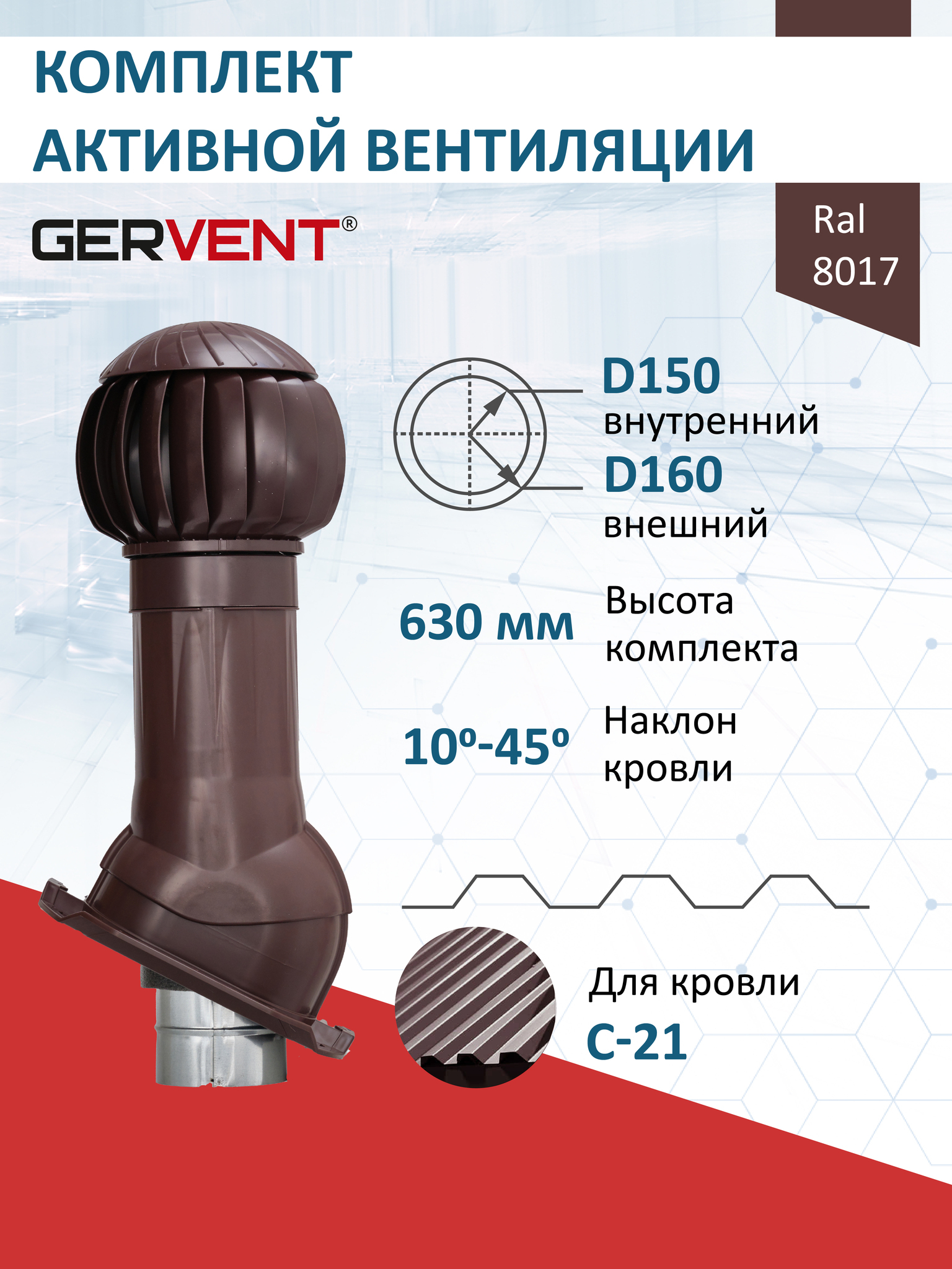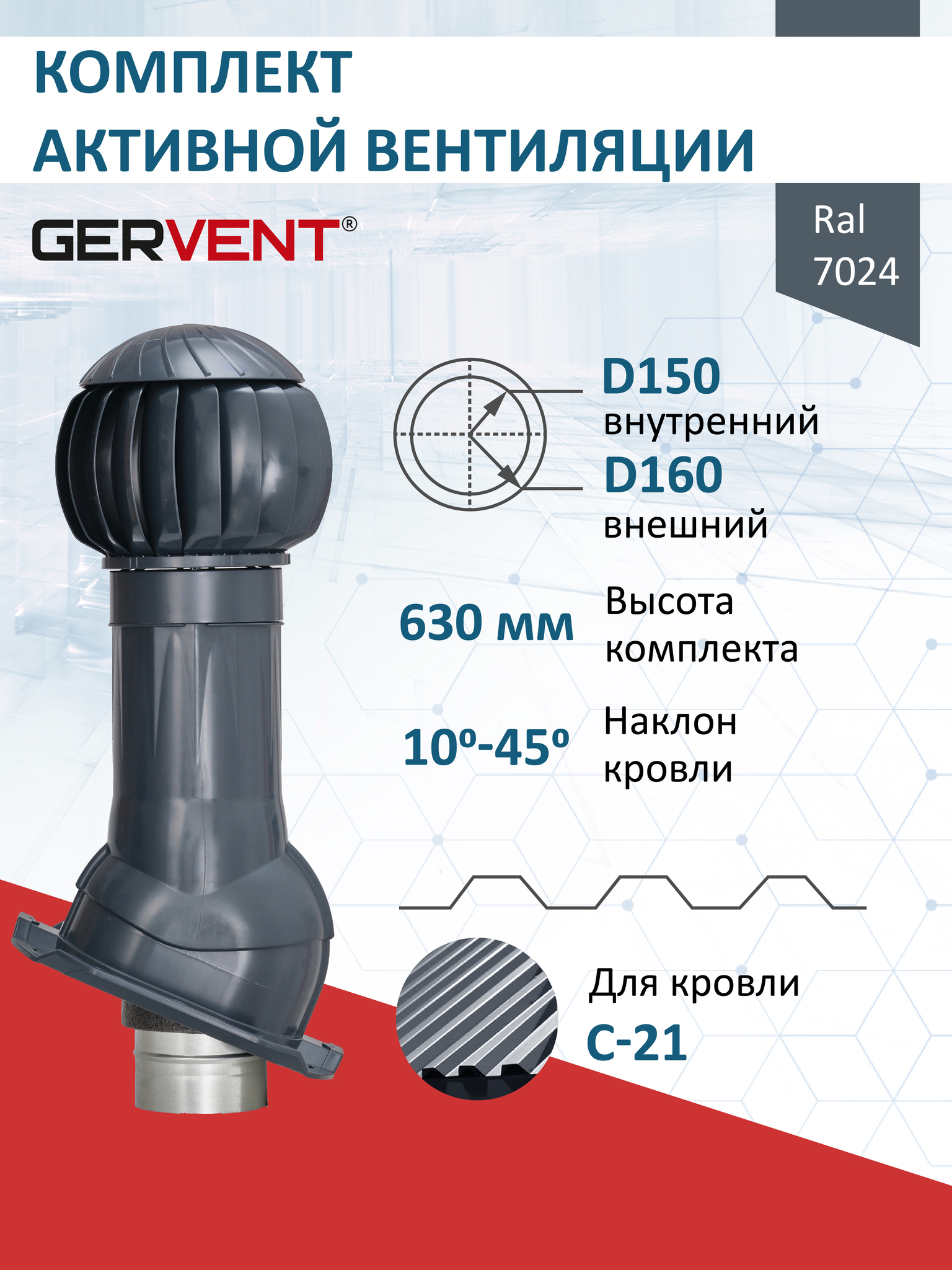 В комплект входит ротационная вентиляционная турбина 160 мм, вентиляционный выход изолированный и проходной элемент для кровли из металлопрофиля МП-21 (С21).