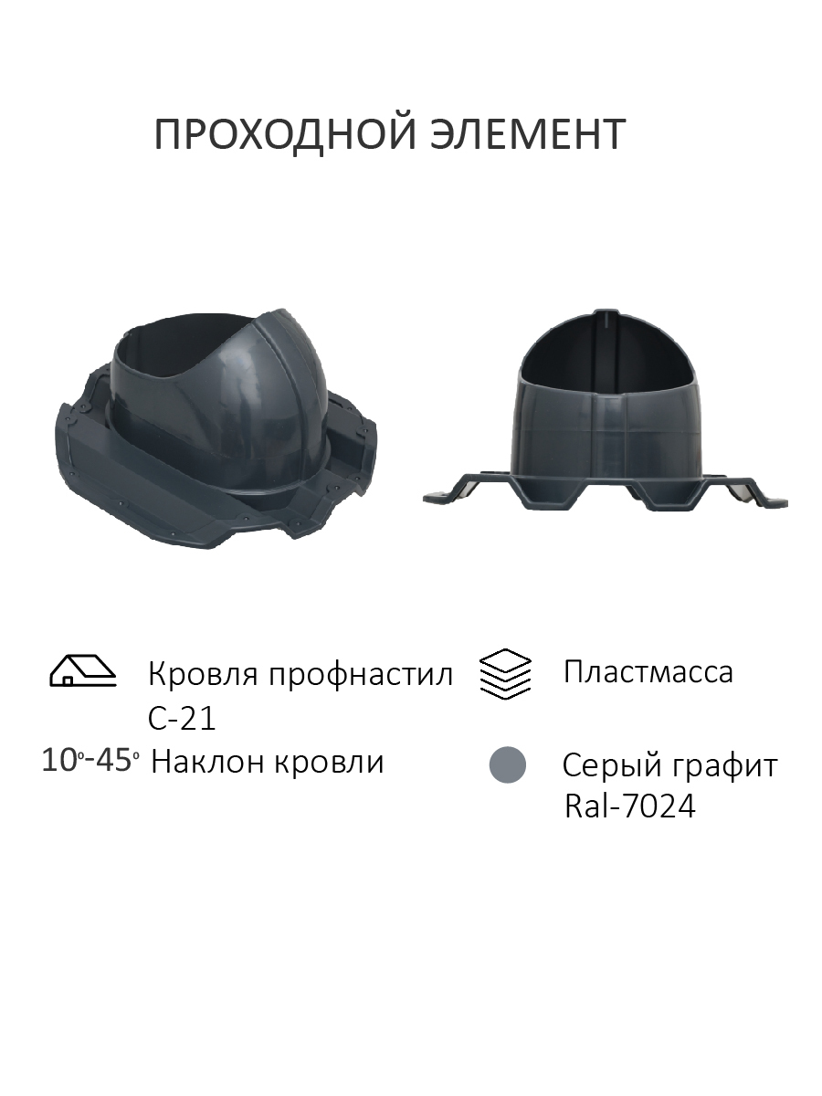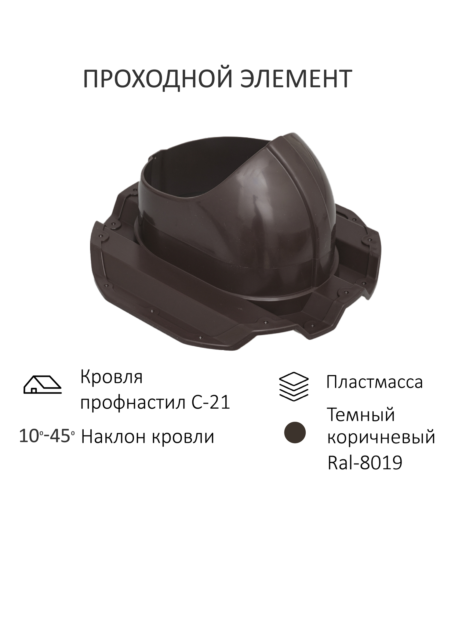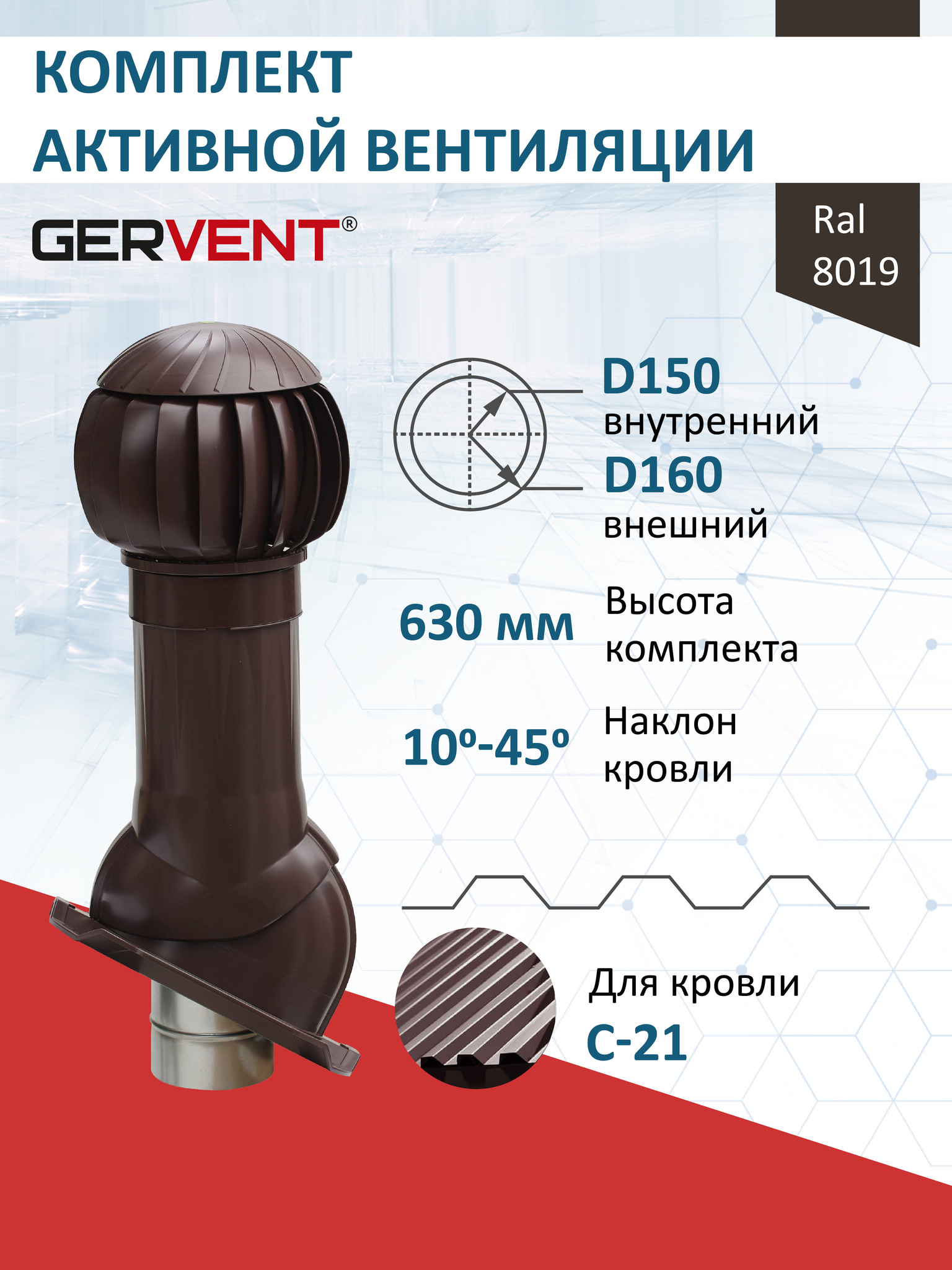 В комплект входит ротационная вентиляционная турбина 160 мм, вентиляционный выход изолированный и проходной элемент для кровли из металлопрофиля МП-21 (С21).
