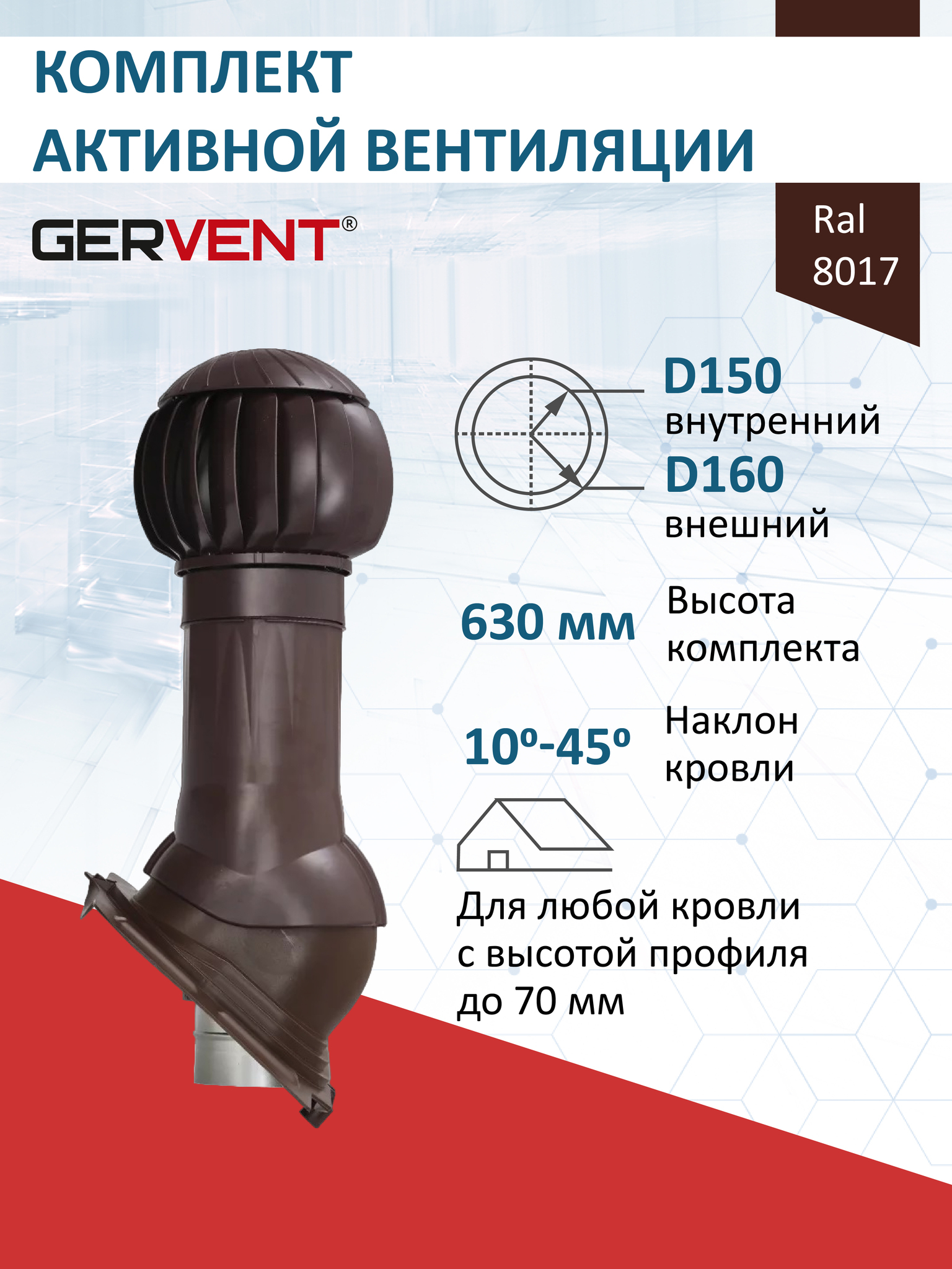 Комплект активной вентиляции: Вентиляционный выход изолированный Ø 150/160 мм высота H-500 серия Static, проходной элемент универсальный кровельный (Universal) серия Static, ротационная вентиляционная турбина D 160 мм серия Twister, коричневый Gervent