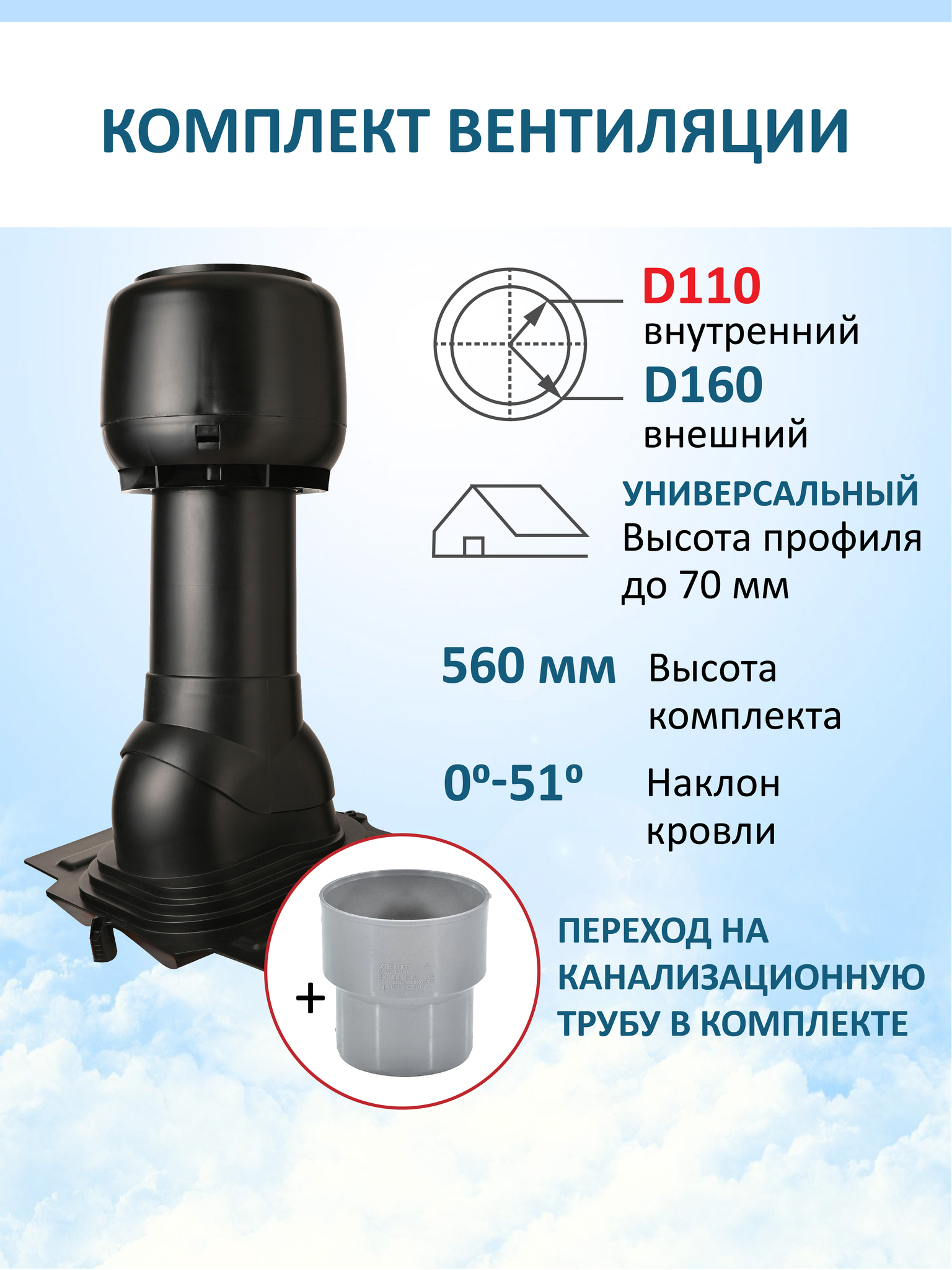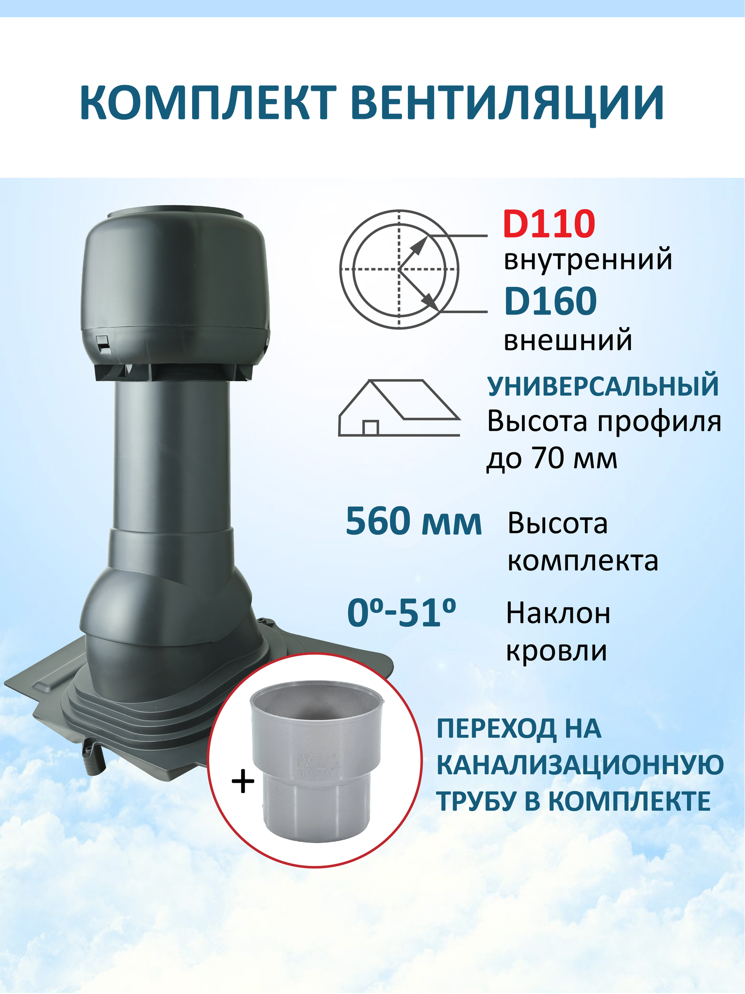 Комплект вентиляции: Колпак D160, вент. выход утепленный высотой Н-500 с переходом D110, проходной элемент универсальный - служит для создания вытяжки в вентиляционном канале частного или многоквартирного дома, в погребе, гараже, курятнике, коровнике, конюшне, предбаннике, в парилке бани, внешней вентиляции септика и складских помещениях.