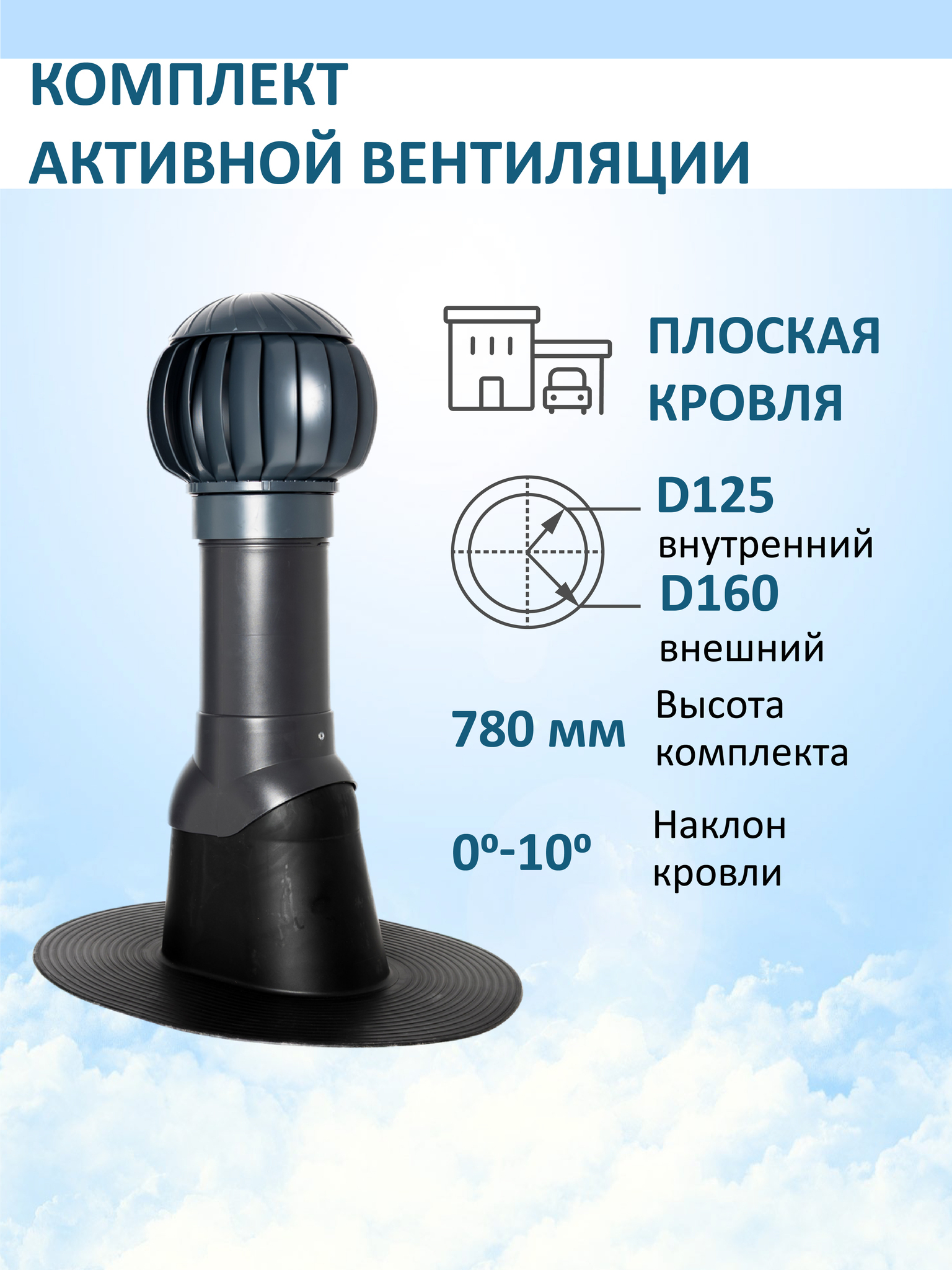 Комплект активной вентиляции: Нанодефлектор ND160, вент. выход утепленный высотой Н-500, для плоской кровли - служит для увеличения тяги в вентиляционном канале частного или многоквартирного дома, в погребе, гараже, курятнике, коровнике, конюшне, предбаннике, в парилке бани, внешней вентиляции септика и складских помещениях.