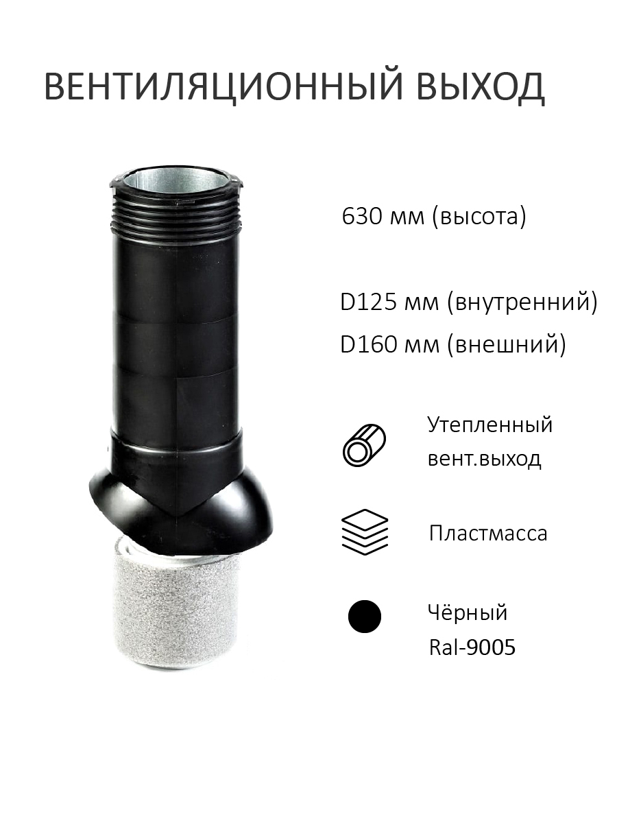 VV160 -700 - Вентиляционный выход изолированный высотой 700 мм, внутренний диаметр 125 мм, наружный 160 мм. Применяется для обеспечения проветривания канализационной системы или для удаления всех запахов и паров, образующихся при приготовлении пищи (кухонная вытяжка). Укомплектован утеплителем из пенополиуретана, предотвращающего образование конденсата. Благодаря использованию инновационных материалов, вентиляционный выход не подвержен оледенению даже во время длительных морозов. Рекомендуем устанавливать на кровлях с круглогодичным проживанием. Имеет снизу посадочную юбку на проходной элемент и сверху резьбу для фиксации колпака. Имеет в комплекте саморезы для фиксации.