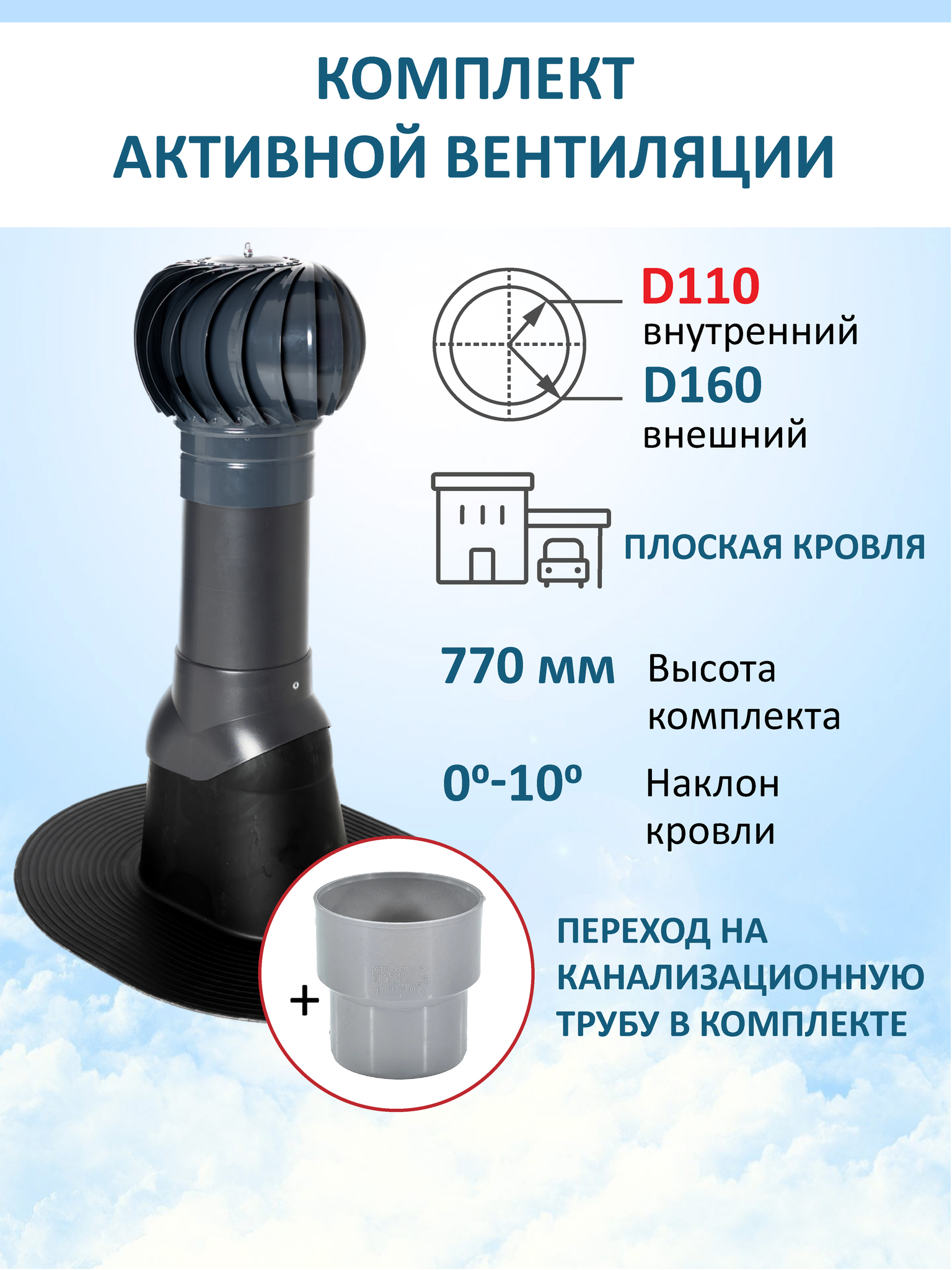 Комплект активной вентиляции: Турбодефлектор TD160, вент. выход утепленный высотой Н-500 с переходом D110, проходной элемент для плоской кровли - служит для увеличения тяги в вентиляционном канале частного или многоквартирного дома, в погребе, гараже, курятнике, коровнике, конюшне, предбаннике, в парилке бани, внешней вентиляции септика и складских помещениях.