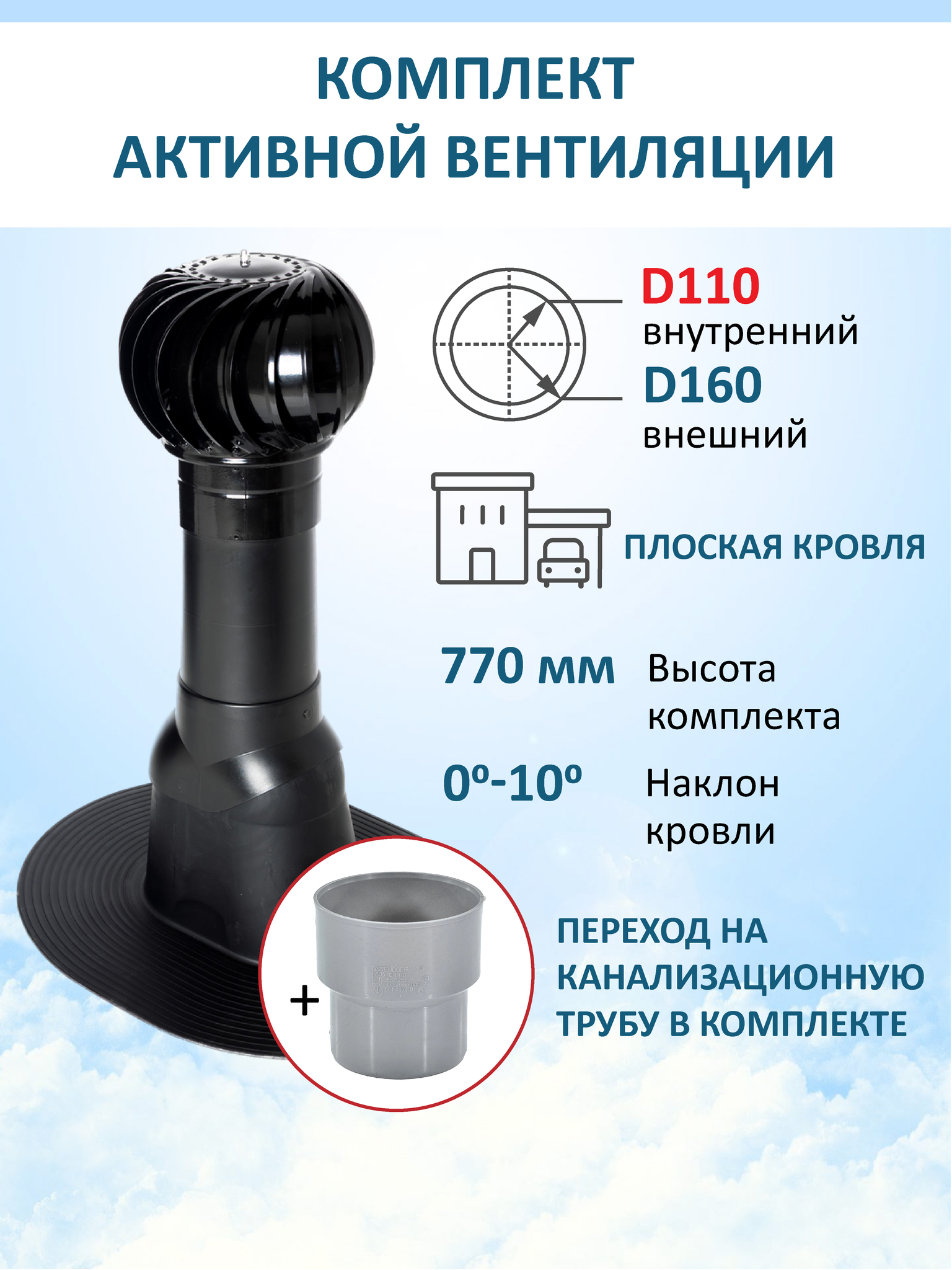 Комплект активной вентиляции: Турбодефлектор TD160, вент. выход утепленный высотой Н-500 с переходом D110, проходной элемент для плоской кровли - служит для увеличения тяги в вентиляционном канале частного или многоквартирного дома, в погребе, гараже, курятнике, коровнике, конюшне, предбаннике, в парилке бани, внешней вентиляции септика и складских помещениях.
