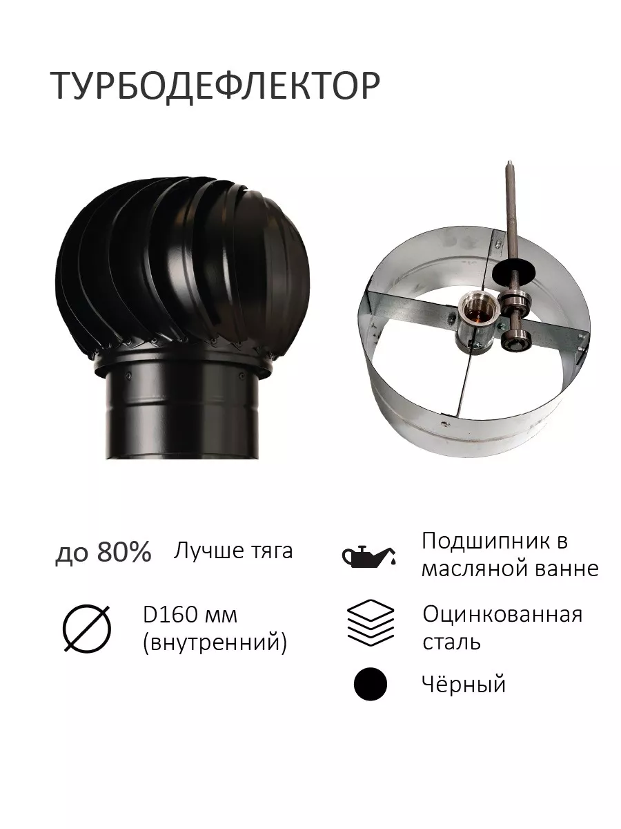 TD160 - Турбодефлектор D160 из оцинкованного окрашенного металла состоит из активной головки с лопастями, установленной на основание с помощью подшипников, которая вращается под действием ветра, удаляя воздух из вентиляционного канала. Ветер является ""двигателем"". Предотвращает обратную тягу. Все детали сделаны из лёгкого металла, поэтому, чтобы турбина начала работать, достаточно самого слабого ветра.