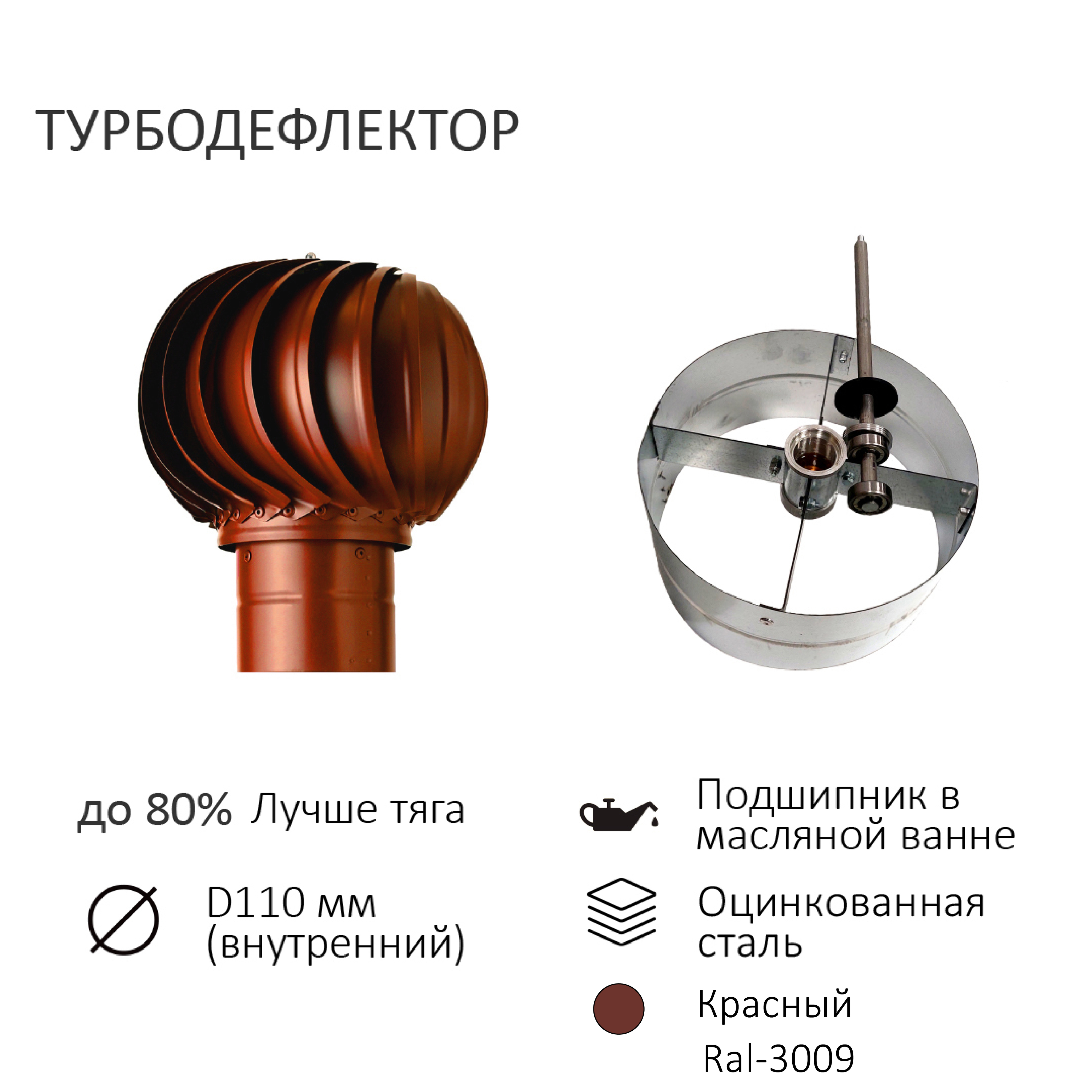 Комплект активной вентиляции: Вентиляционный выход D110 не утепленный высота H=500 мм, проходной элемент для битумной кровли, турбодефлектор Ø 110 мм, красная окись - готовый набор для организации мощной и энергоэффективной вытяжки на кровле из битумной черепицы. В отличие от пассивных систем, этот комплект оснащён турбодефлектором, который усиливает тягу за счёт энергии ветра, обеспечивая интенсивный воздухообмен без затрат на электроэнергию.