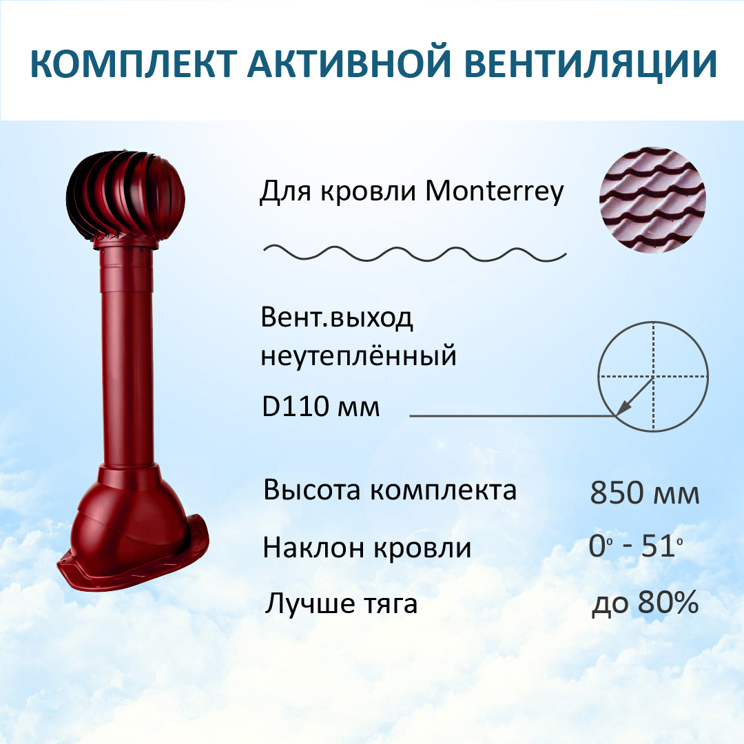 Комплект активной вентиляции: Вентиляционный выход D110 не утепленный высота H=500 мм, проходной элемент для металлочерепицы Monterrey, турбодефлектор Ø 110 мм, красное вино - служит для увеличения тяги в вентиляционном канале частного или многоквартирного дома, в погребе, гараже, курятнике, коровнике, конюшне, предбаннике, в парилке бани, внешней вентиляции септика и складских помещениях.