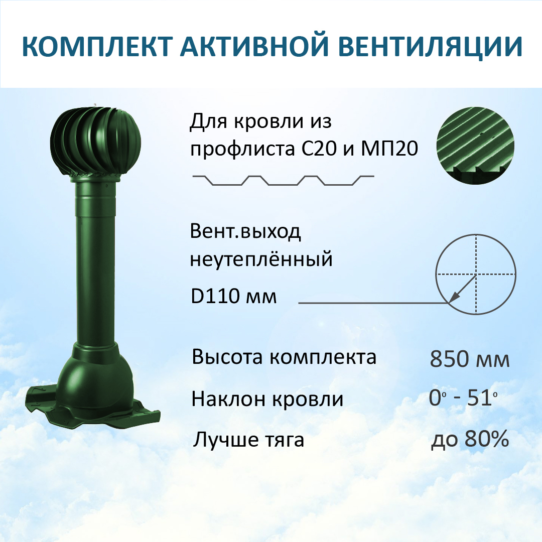 Комплект активной вентиляции: Вентиляционный выход D110 не утепленный высота H=500 мм, проходной элемент PROF-20 для металлопрофиля кровельного профнастила МП20 иС20, турбодефлектор Ø 110 мм, зеленый - служит для увеличения тяги в вентиляционном канале частного или многоквартирного дома, в погребе, гараже, курятнике, коровнике, конюшне, предбаннике, в парилке бани, внешней вентиляции септика и складских помещениях.