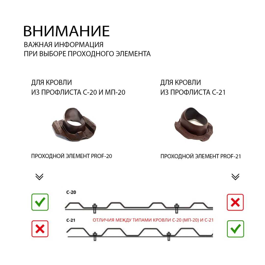 - Проходной элемент PROF-20. Обеспечивает герметичность в месте вывода трубы через кровлю из профнастила. Устанавливается на готовое покрытие. Бутилкаучуковый уплотнитель с липкой основой гарантирует защиту от протечек.