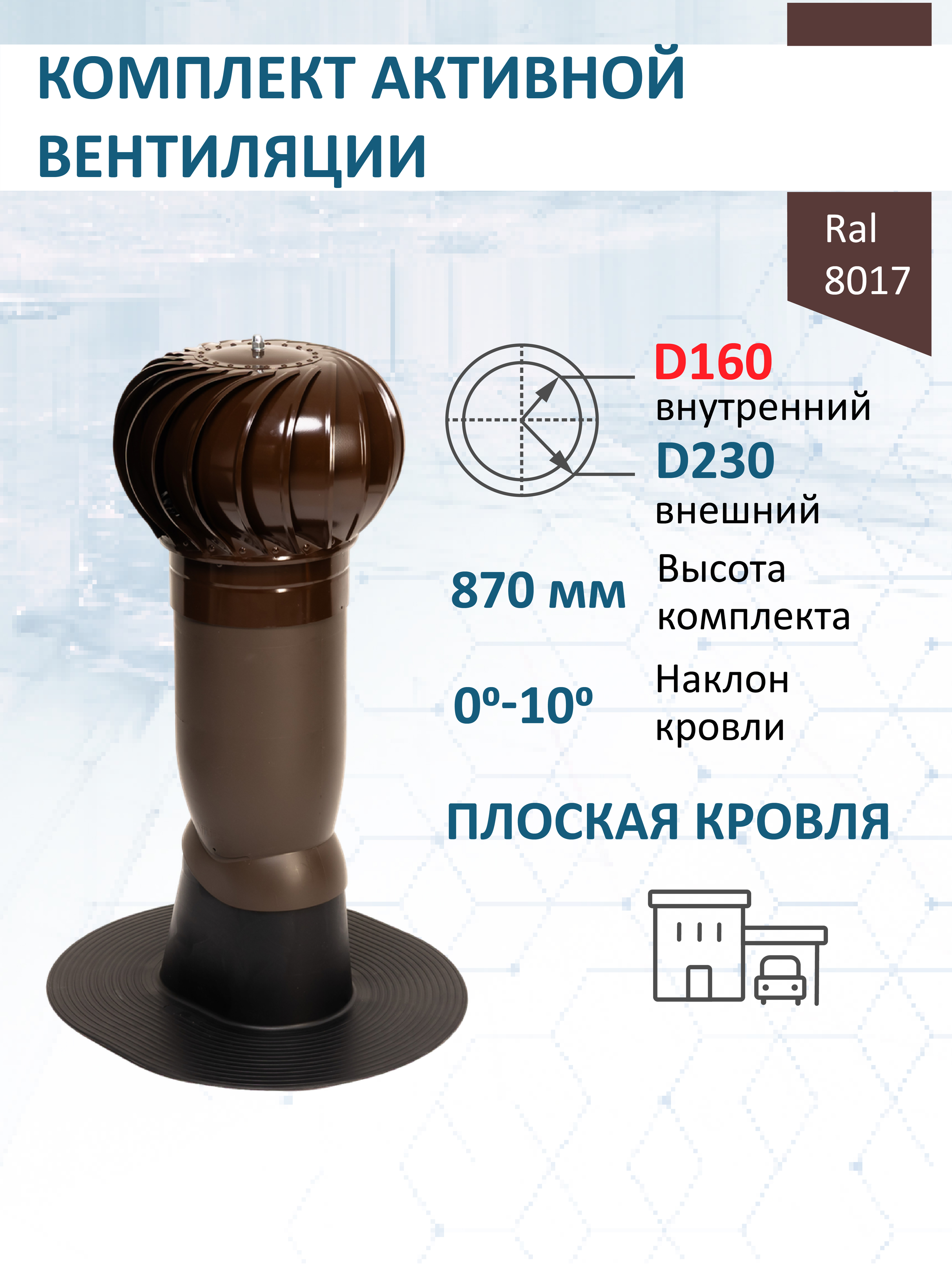 Комплект активной вентиляции: Вентиляционный выход изолированный Vilpe D160/225 утепленный высота H=500 мм, проходной элемент для плоской кровли ТП-187, турбодефлектор Ø 230 мм, коричневый - служит для увеличения тяги в вентиляционном канале частного или многоквартирного дома, в погребе, гараже, курятнике, коровнике, конюшне, предбаннике, в парилке бани, внешней вентиляции септика и складских помещениях.