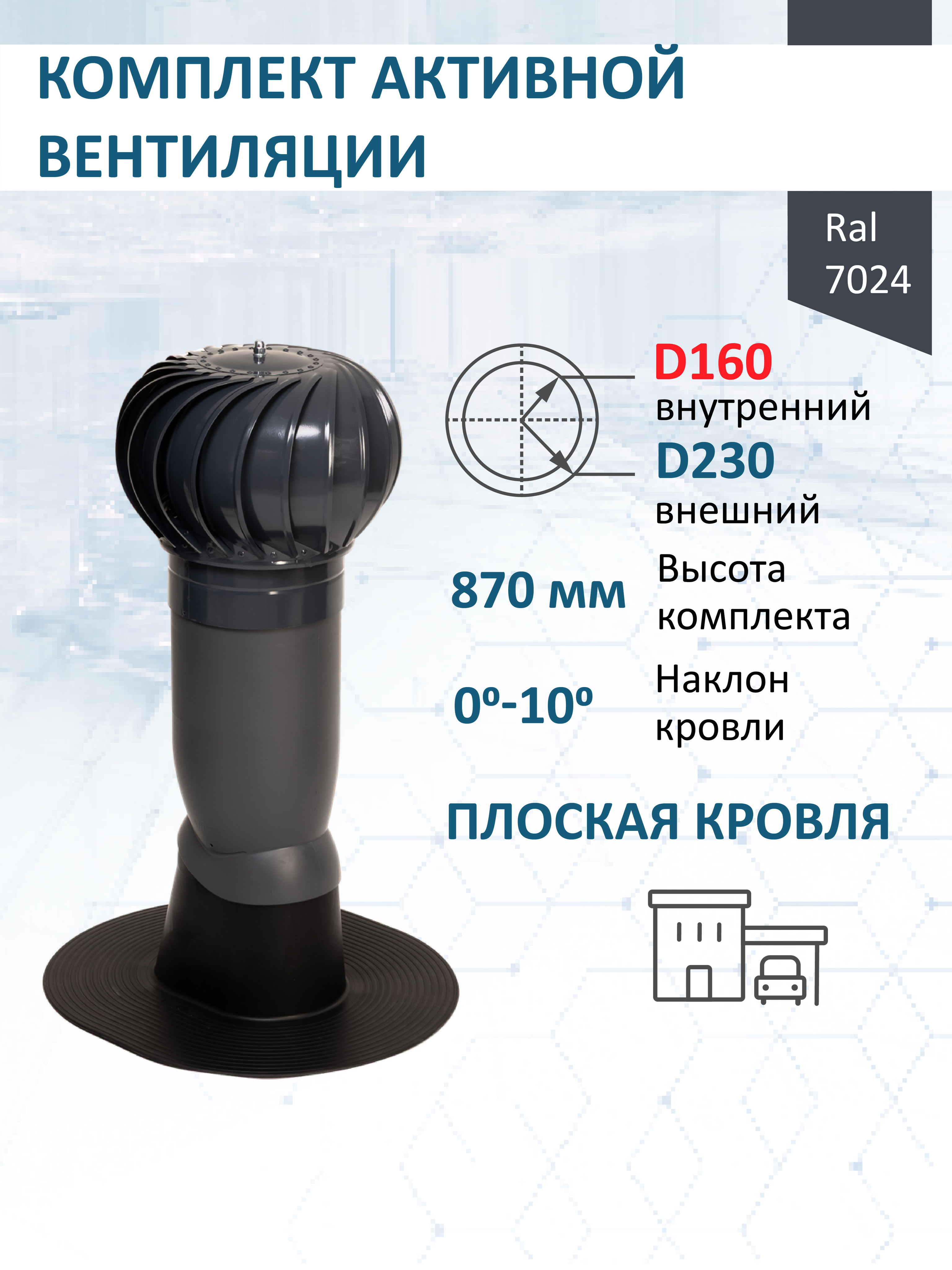 Комплект активной вентиляции: Вентиляционный выход изолированный Vilpe D160/225 утепленный высота H=500 мм, проходной элемент для плоской кровли ТП-187, турбодефлектор Ø 230 мм, серый графит - служит для увеличения тяги в вентиляционном канале частного или многоквартирного дома, в погребе, гараже, курятнике, коровнике, конюшне, предбаннике, в парилке бани, внешней вентиляции септика и складских помещениях.