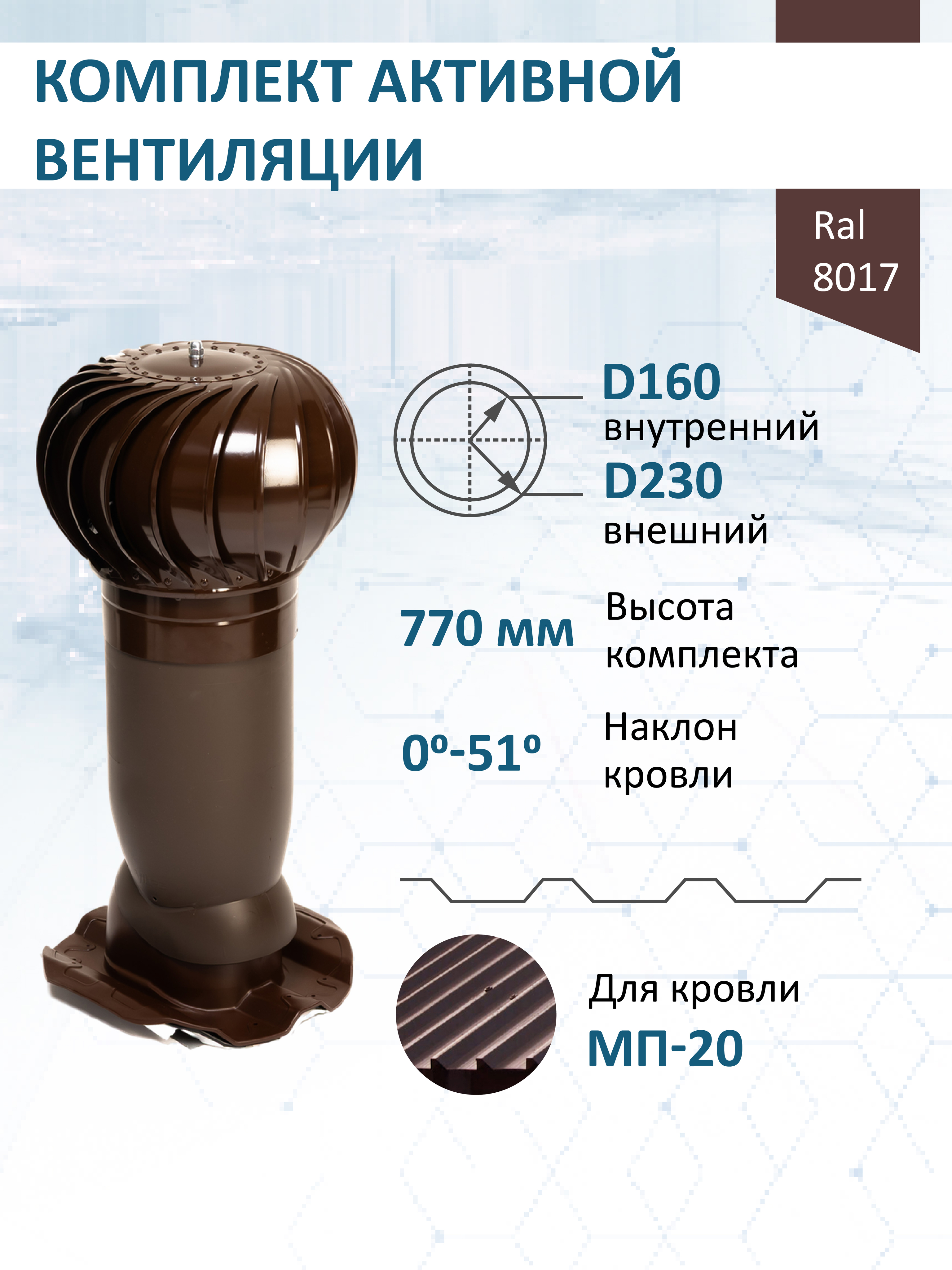 Комплект активной вентиляции: Вентиляционный выход изолированный Vilpe D160/225 утепленный высота H=500 мм, проходной элемент PROF-20 для металлопрофиля кровельного профнастила МП20 иС20, турбодефлектор Ø 230 мм, коричневый - служит для увеличения тяги в вентиляционном канале частного или многоквартирного дома, в погребе, гараже, курятнике, коровнике, конюшне, предбаннике, в парилке бани, внешней вентиляции септика и складских помещениях.