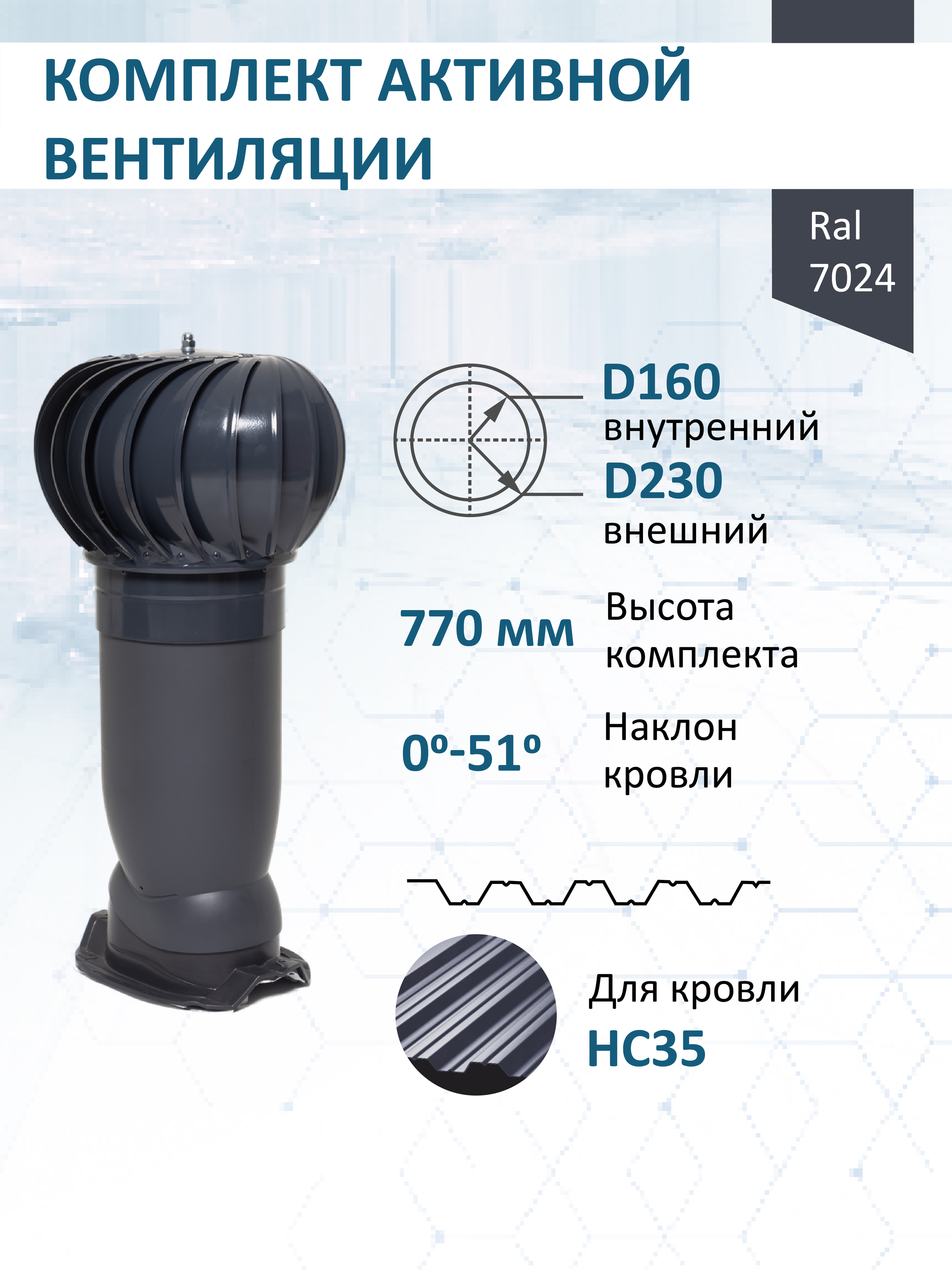 Комплект активной вентиляции: Вентиляционный выход изолированный Vilpe D160/225 утепленный высота H=500 мм, проходной элемент PROF-35 для металлопрофиля кровельного профнастила 35мм, турбодефлектор Ø 230 мм, серый графит - служит для увеличения тяги в вентиляционном канале частного или многоквартирного дома, в погребе, гараже, курятнике, коровнике, конюшне, предбаннике, в парилке бани, внешней вентиляции септика и складских помещениях.