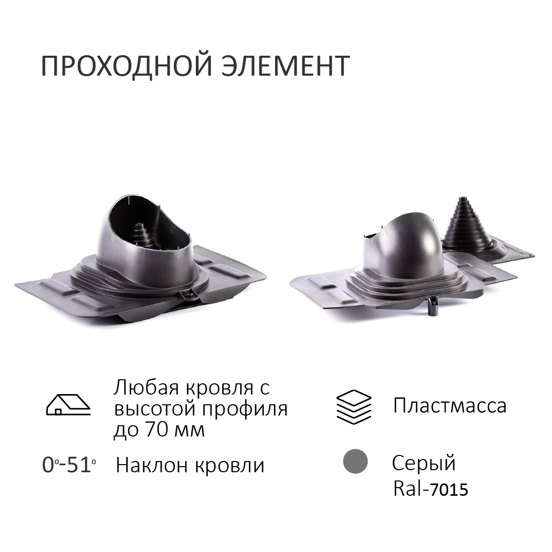 U - Проходной элемент UNIVERSAL применяется на кровлях из металлочерепицы или на других типах покрытия скатных кровель с любым типом профиля с высотой до 70 мм (в том числе и натуральная черепица при использовании сверла по стеклу и керамике, и саморезов для кирпича) для установки вентиляционных труб.