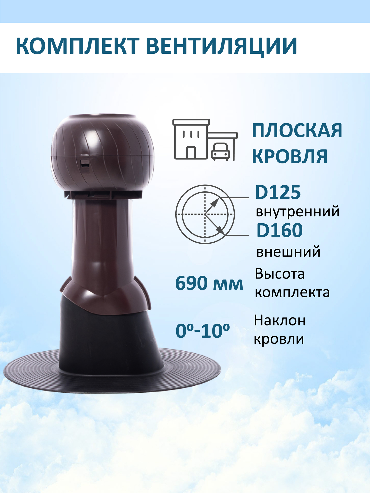 Комплект вентиляции: Вентиляционный выход изолированный Ø 125/160 мм высота H-500 серия Static, проходной элемент для плоской кровли ТП-187, дефлектор статический (колпак) Ø 160 мм серии Static, коричневый Gervent