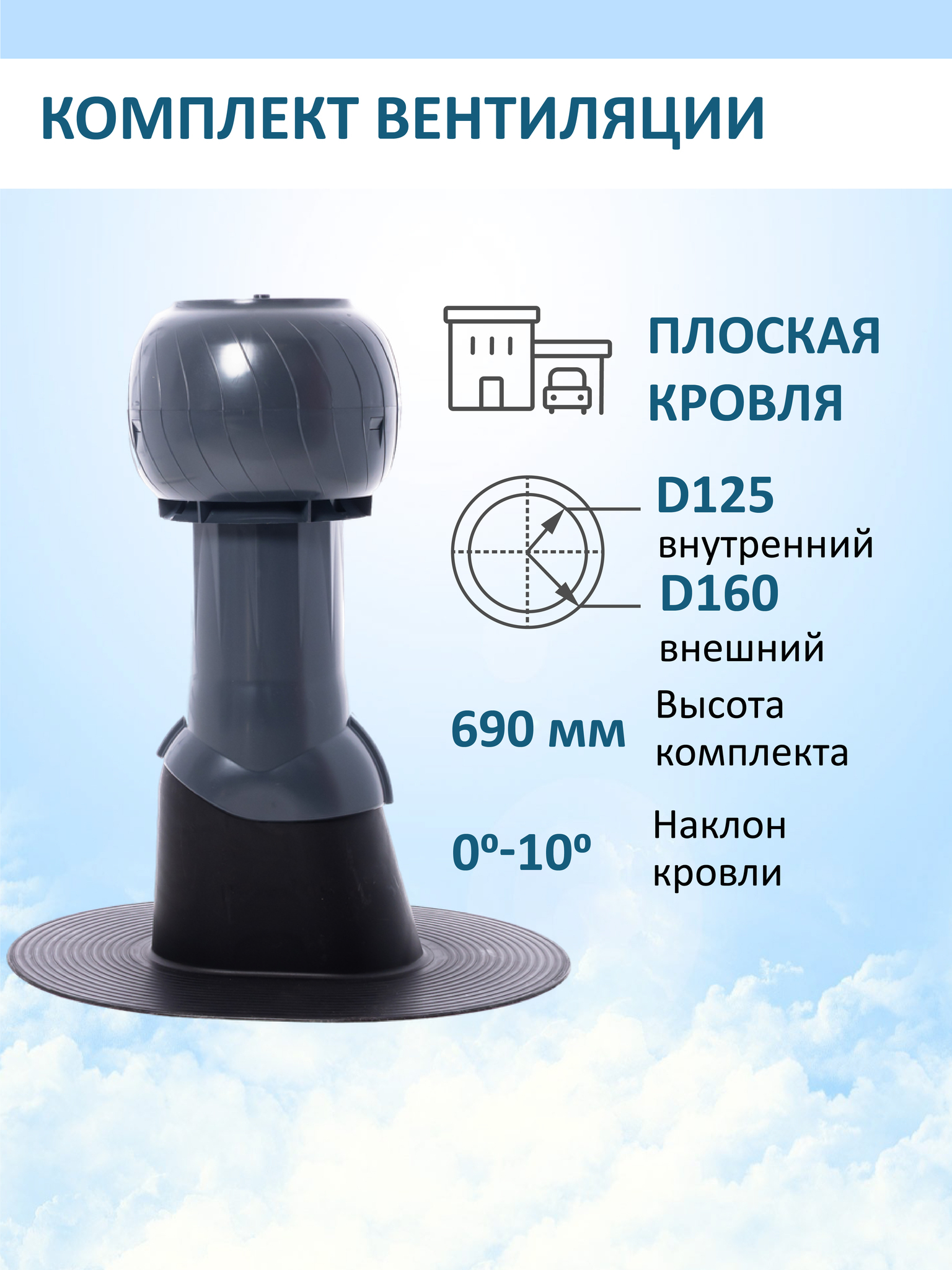 Вентиляционный выход изолированный D125/160 H=500 - 1 шт; Проходной элемент для плоской кровли - 1 шт; Колпак вентиляционный D160 - 1 шт.