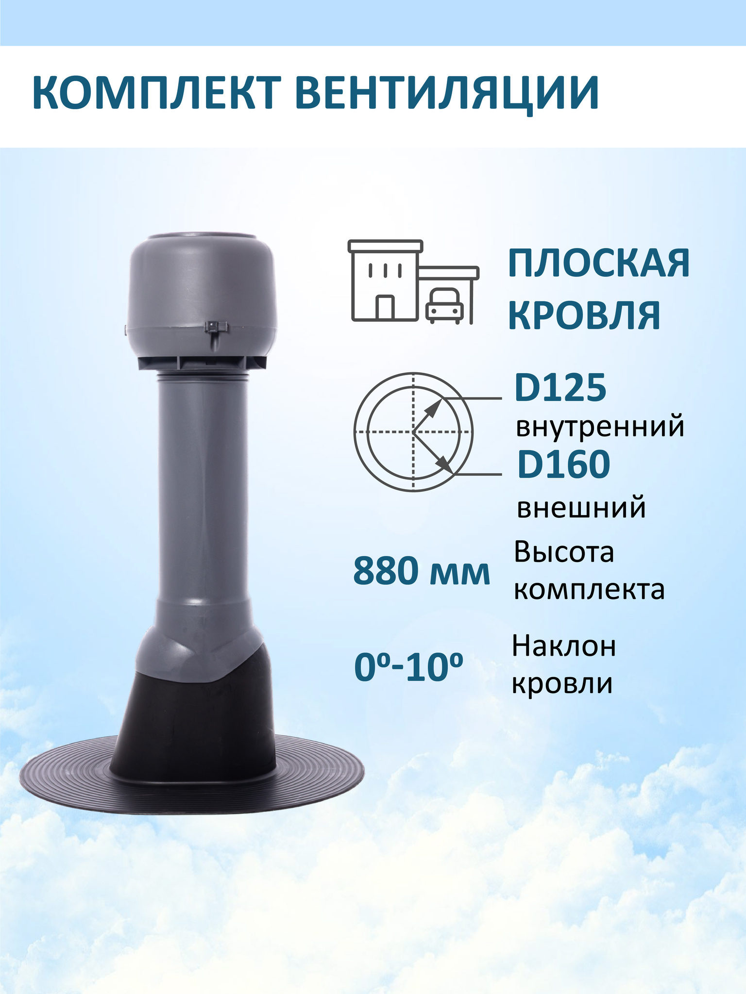 Комплект вентиляции: Колпак D160, вент. выход утепленный высотой Н-700, проходной элемент для плоской кровли - служит для создания вытяжки в вентиляционном канале частного или многоквартирного дома, в погребе, гараже, курятнике, коровнике, конюшне, предбаннике, в парилке бани, внешней вентиляции септика и складских помещениях.