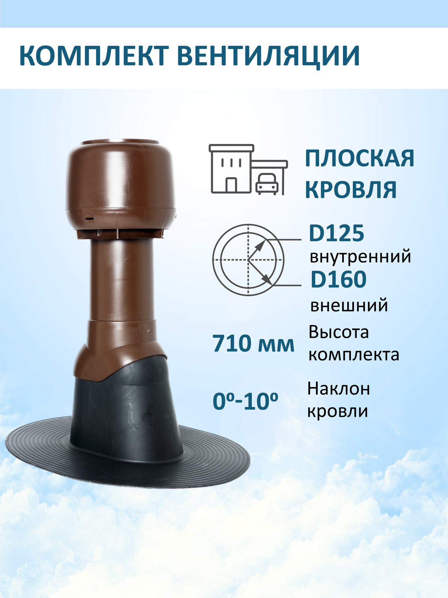 Комплект вентиляции: Вентиляционный выход изолированный D125/160 утепленный высота H=500 мм, проходной элемент для плоской кровли ТП-187, колпак вентиляционный D160 мм, коричневый