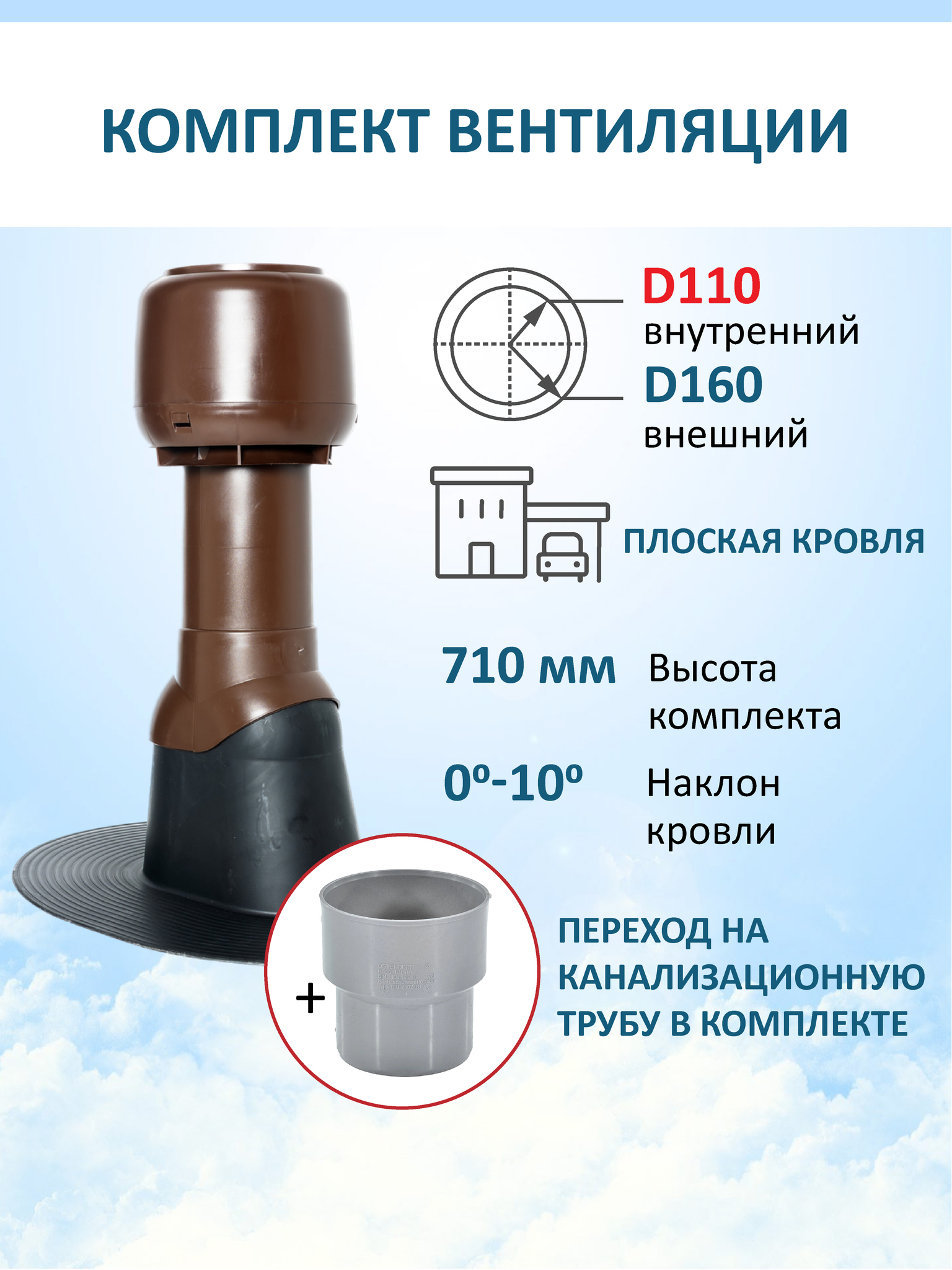 Комплект вентиляции: Колпак D160, вент. выход утепленный высотой Н-500 с переходом D110, для плоской кровли - служит для создания вытяжки в вентиляционном канале частного или многоквартирного дома, в погребе, гараже, курятнике, коровнике, конюшне, предбаннике, в парилке бани, внешней вентиляции септика и складских помещениях.