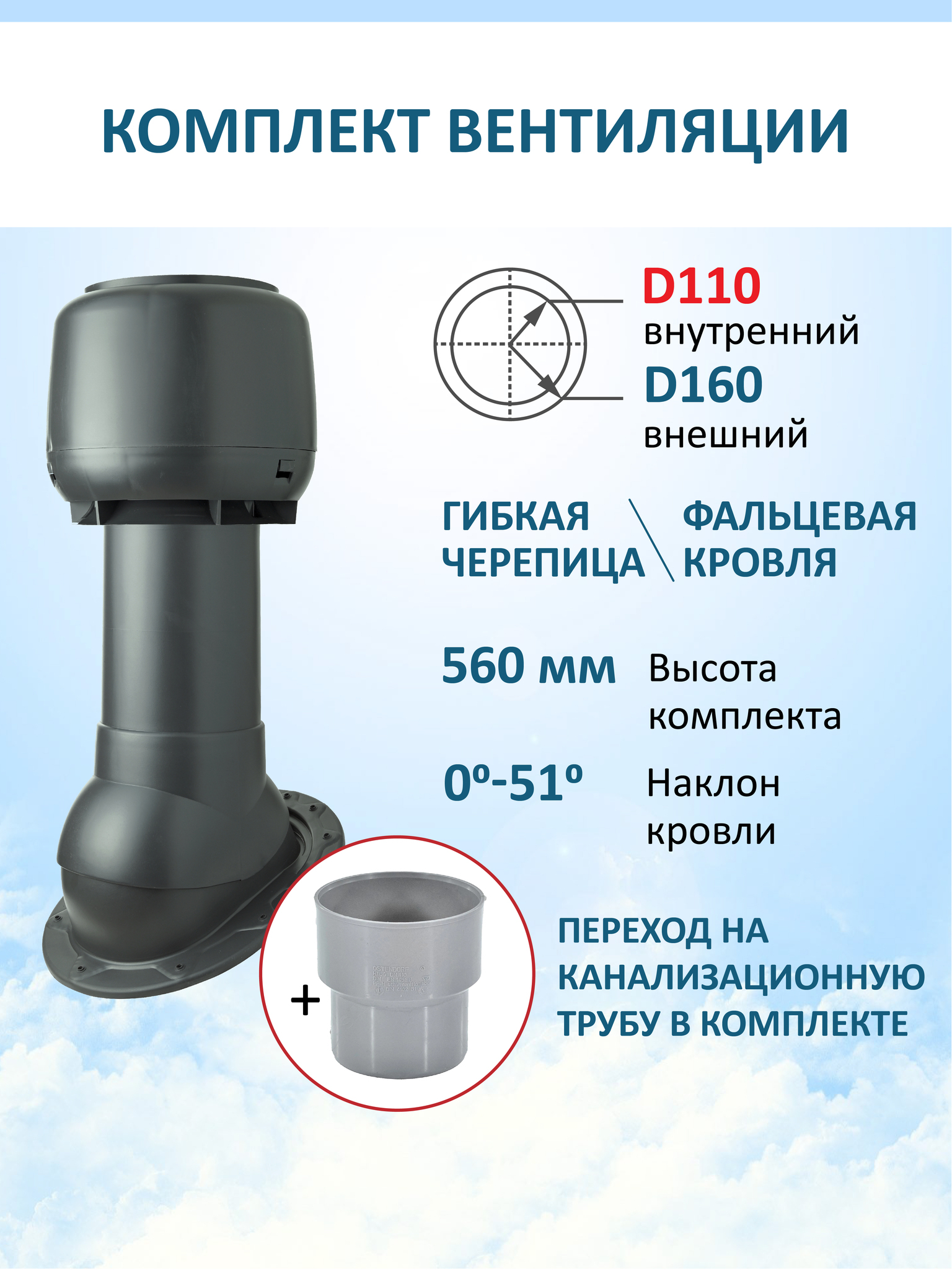 Комплект вентиляции: Колпак D160, вент. выход утепленный высотой Н-500 с переходом D110, для скатной кровли - служит для создания вытяжки в вентиляционном канале частного или многоквартирного дома, в погребе, гараже, курятнике, коровнике, конюшне, предбаннике, в парилке бани, внешней вентиляции септика и складских помещениях.