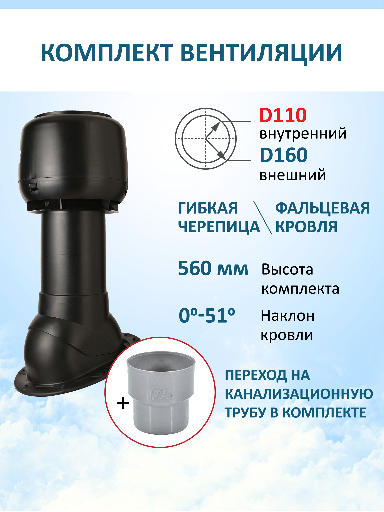 Комплект вентиляции: Колпак D160, вент. выход утепленный высотой Н-500 с переходом D110, для скатной кровли - служит для создания вытяжки в вентиляционном канале частного или многоквартирного дома, в погребе, гараже, курятнике, коровнике, конюшне, предбаннике, в парилке бани, внешней вентиляции септика и складских помещениях.