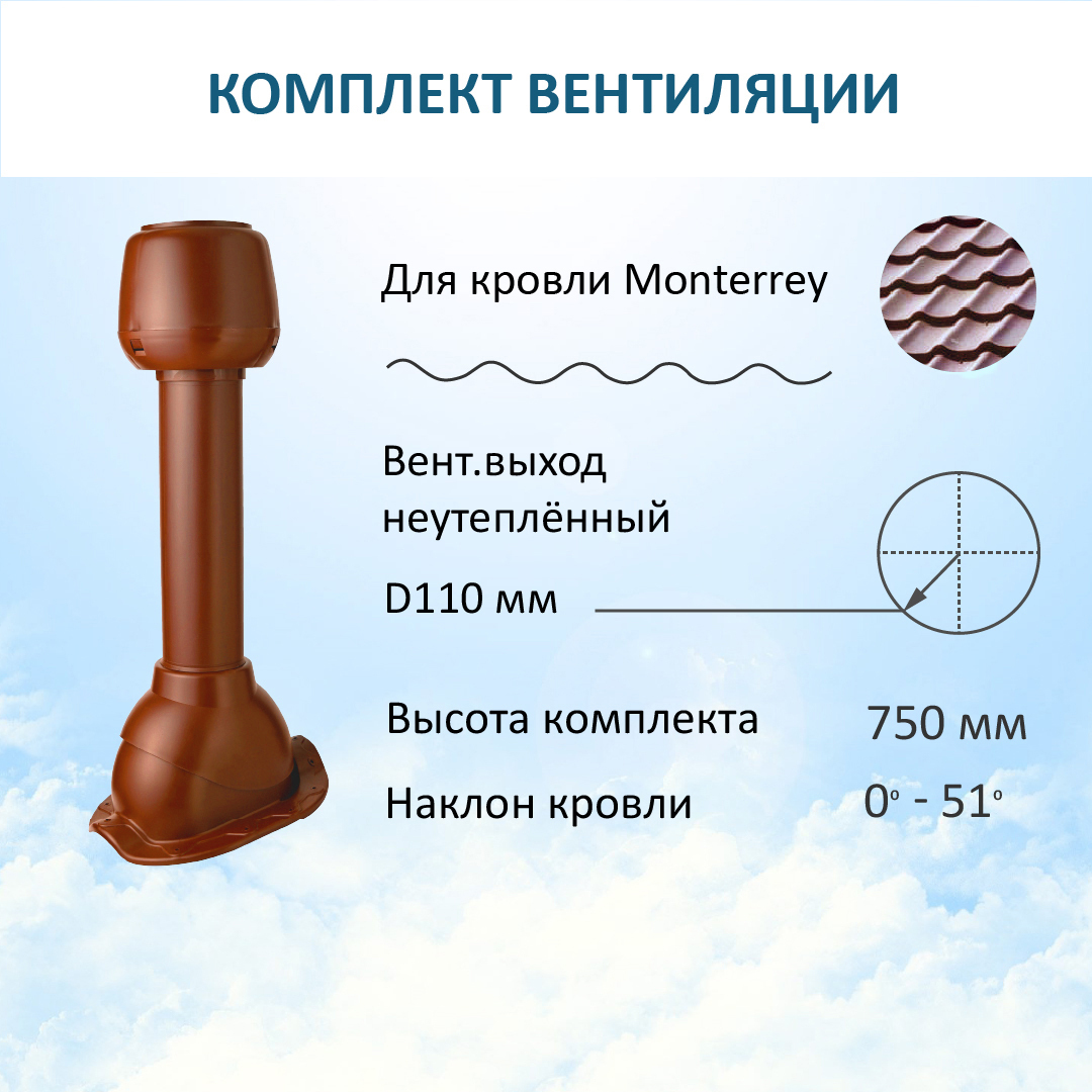 Комплект вентиляции: Вентиляционный выход D110 не утепленный высота H=500 мм, проходной элемент для металлочерепицы Monterrey, колпак вентиляционный D110, красная окись - готовый набор для профессионального монтажа кровельной вентиляции на кровле из металлочерепицы Monterrey. Обеспечивает эффективную вытяжку, предотвращает появление запахов, сырости и плесени. Идеален для частных и многоквартирных домов, гаражей, погребов, бань, а также хозяйственных построек.
