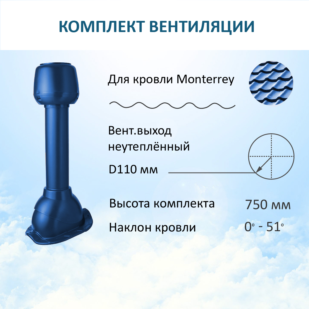 Комплект вентиляции: Вентиляционный выход D110 не утепленный высота H=500 мм, проходной элемент для металлочерепицы Monterrey, колпак вентиляционный D110, синий - служит для создания вытяжки в вентиляционном канале частного или многоквартирного дома, в погребе, гараже, курятнике, коровнике, конюшне, предбаннике, в парилке бани, внешней вентиляции септика и складских помещениях.