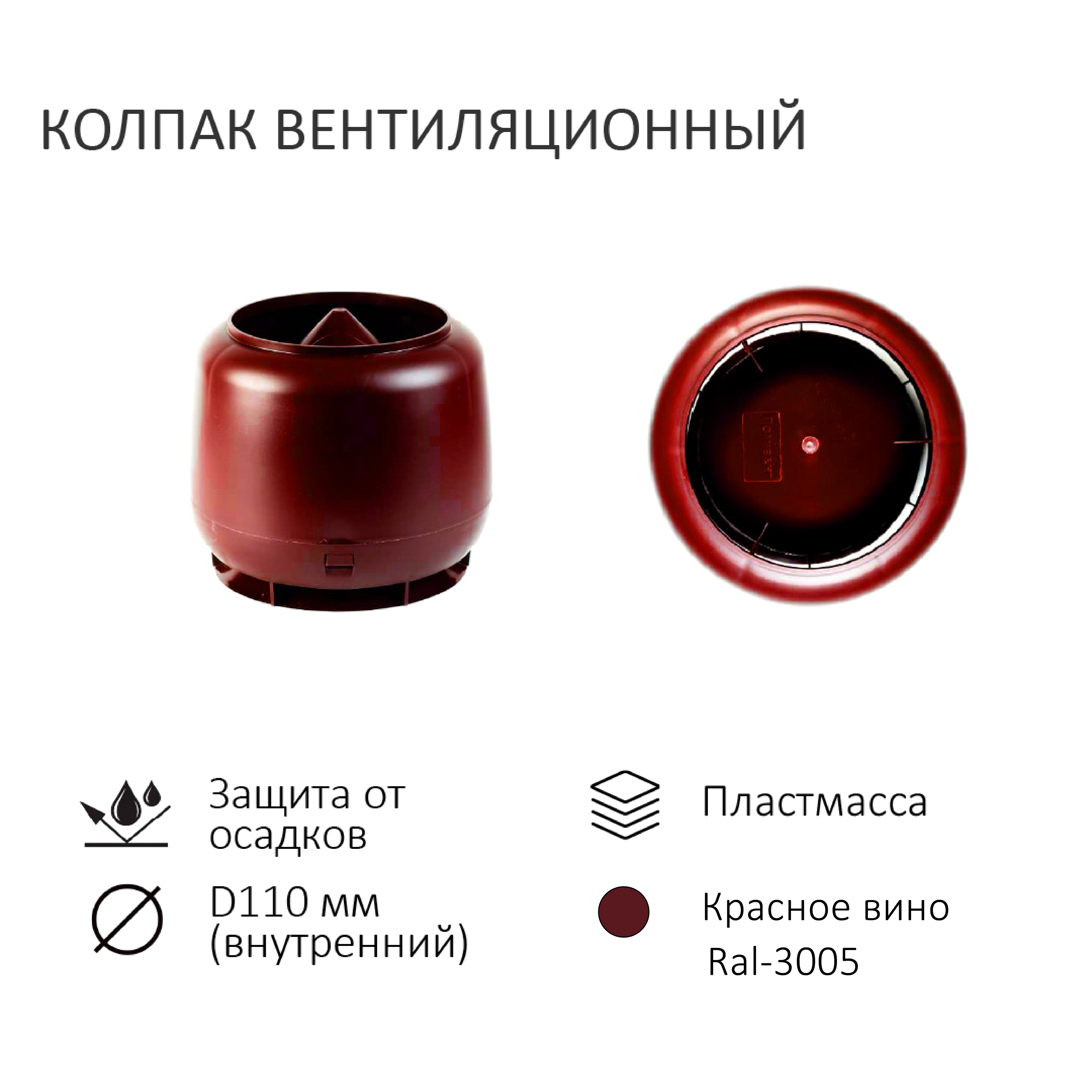 Комплект вентиляции: Вентиляционный выход D110 не утепленный высота H=500 мм, проходной элемент универсальный кровельный (Universal), колпак вентиляционный D110, красное вино - служит для создания вытяжки в вентиляционном канале частного или многоквартирного дома, в погребе, гараже, курятнике, коровнике, конюшне, предбаннике, в парилке бани, внешней вентиляции септика и складских помещениях.