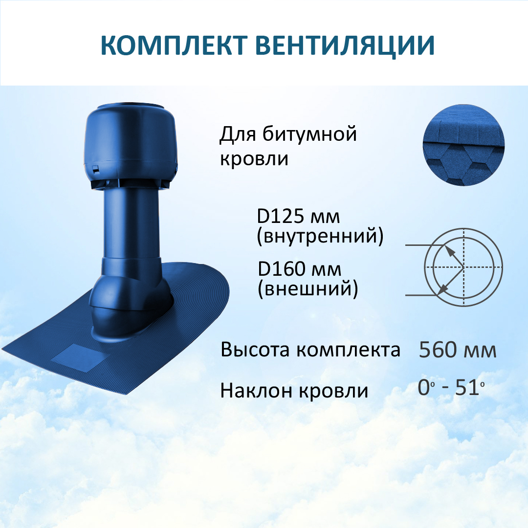 Комплект вентиляции: Вентиляционный выход изолированный D125/160 утепленный высота H=500 мм, проходной элемент для битумной кровли, колпак вентиляционный D160 мм, синий - служит для создания вытяжки в вентиляционном канале частного или многоквартирного дома, в погребе, гараже, курятнике, коровнике, конюшне, предбаннике, в парилке бани, внешней вентиляции септика и складских помещениях.
