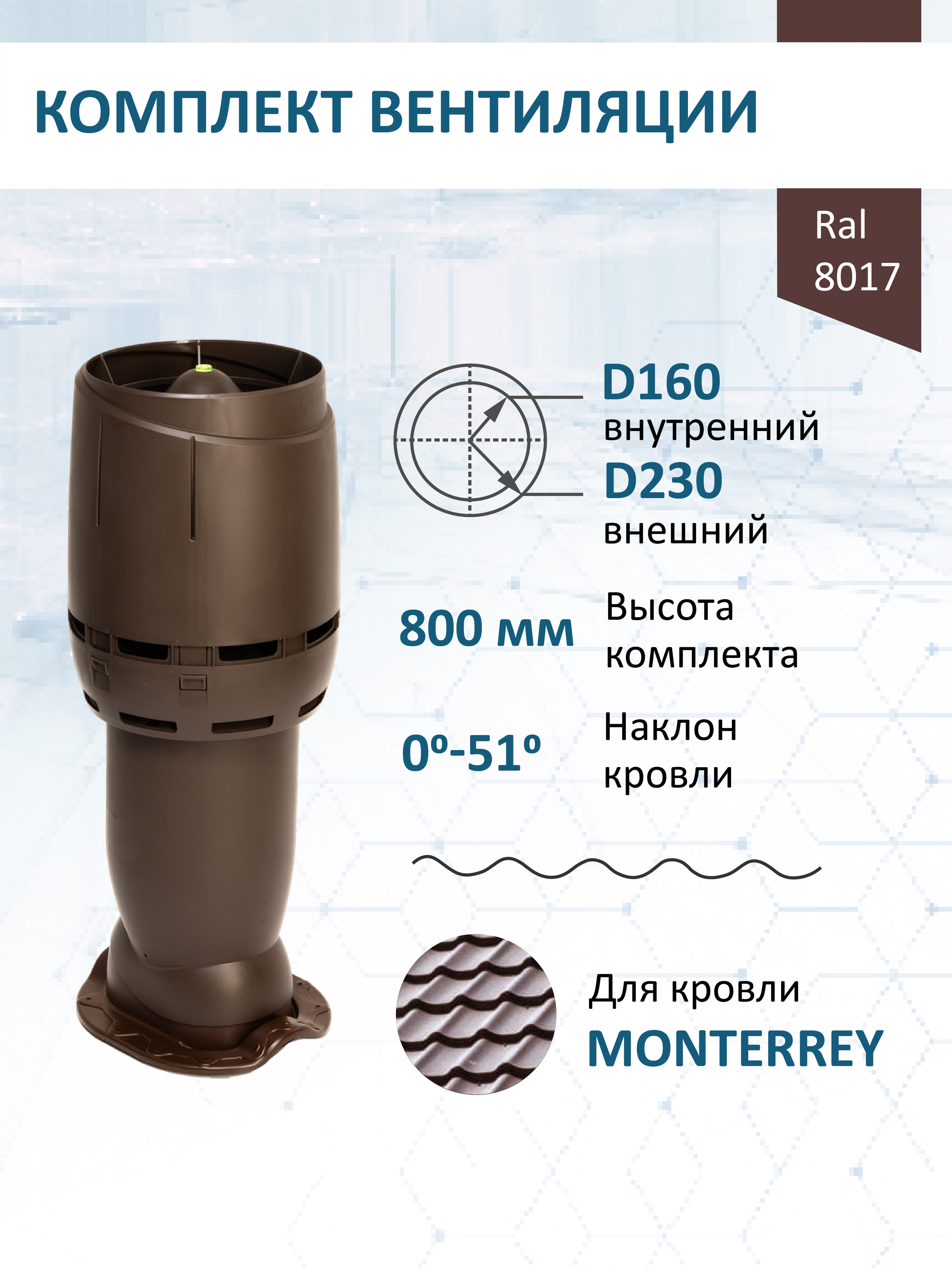 Комплект вентиляции: Вентиляционный выход изолированный Vilpe D160/225 утепленный высота H=500 мм, проходной элемент для металлочерепицы Monterrey, колпак Ø 230 мм, коричневый - служит для увеличения тяги в вентиляционном канале частного или многоквартирного дома, в погребе, гараже, курятнике, коровнике, конюшне, предбаннике, в парилке бани, внешней вентиляции септика и складских помещениях.