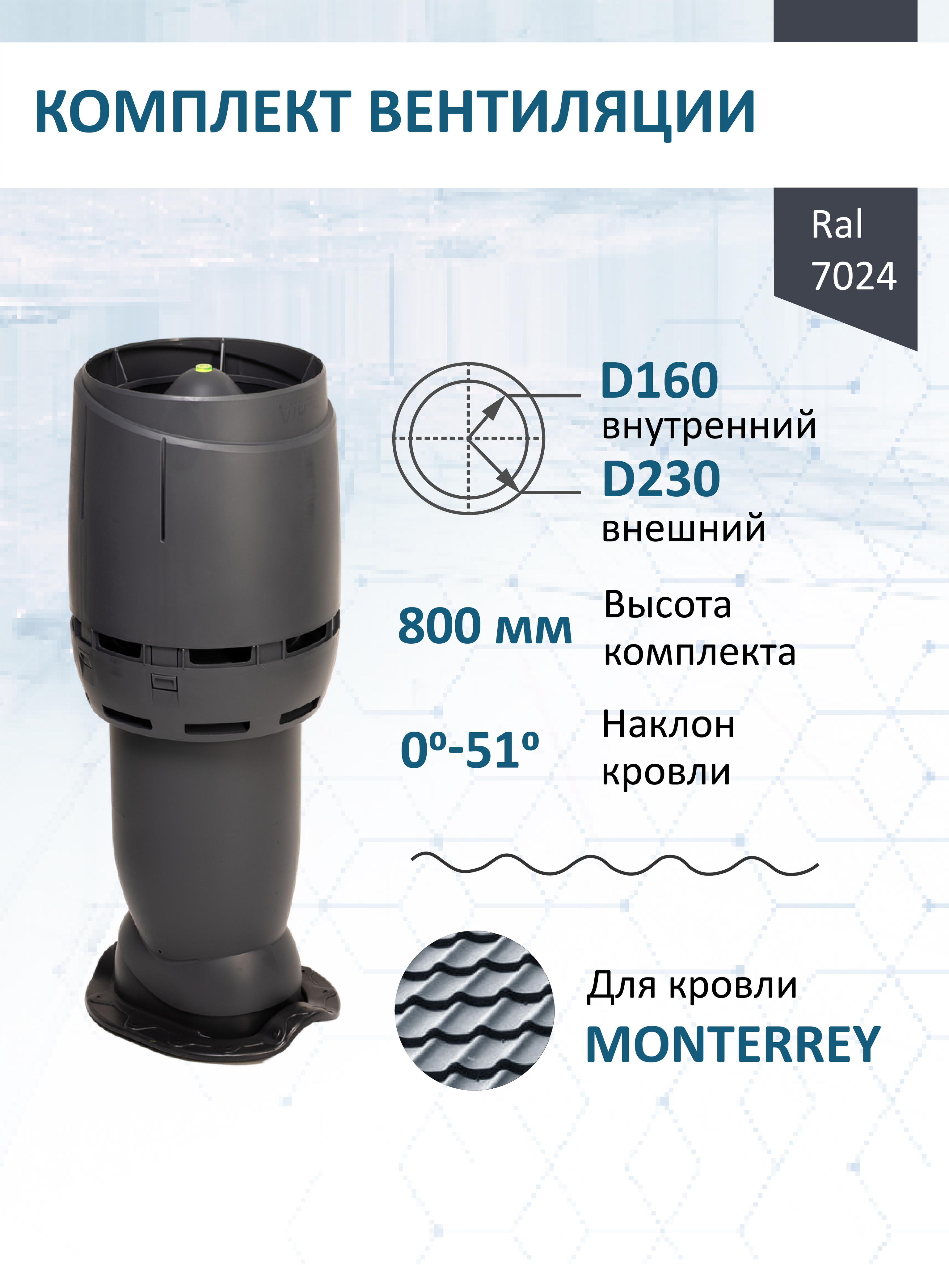 Комплект вентиляции: Вентиляционный выход изолированный Vilpe D160/225 утепленный высота H=500 мм, проходной элемент для металлочерепицы Monterrey, колпак Ø 230 мм, серый графит - служит для увеличения тяги в вентиляционном канале частного или многоквартирного дома, в погребе, гараже, курятнике, коровнике, конюшне, предбаннике, в парилке бани, внешней вентиляции септика и складских помещениях.
