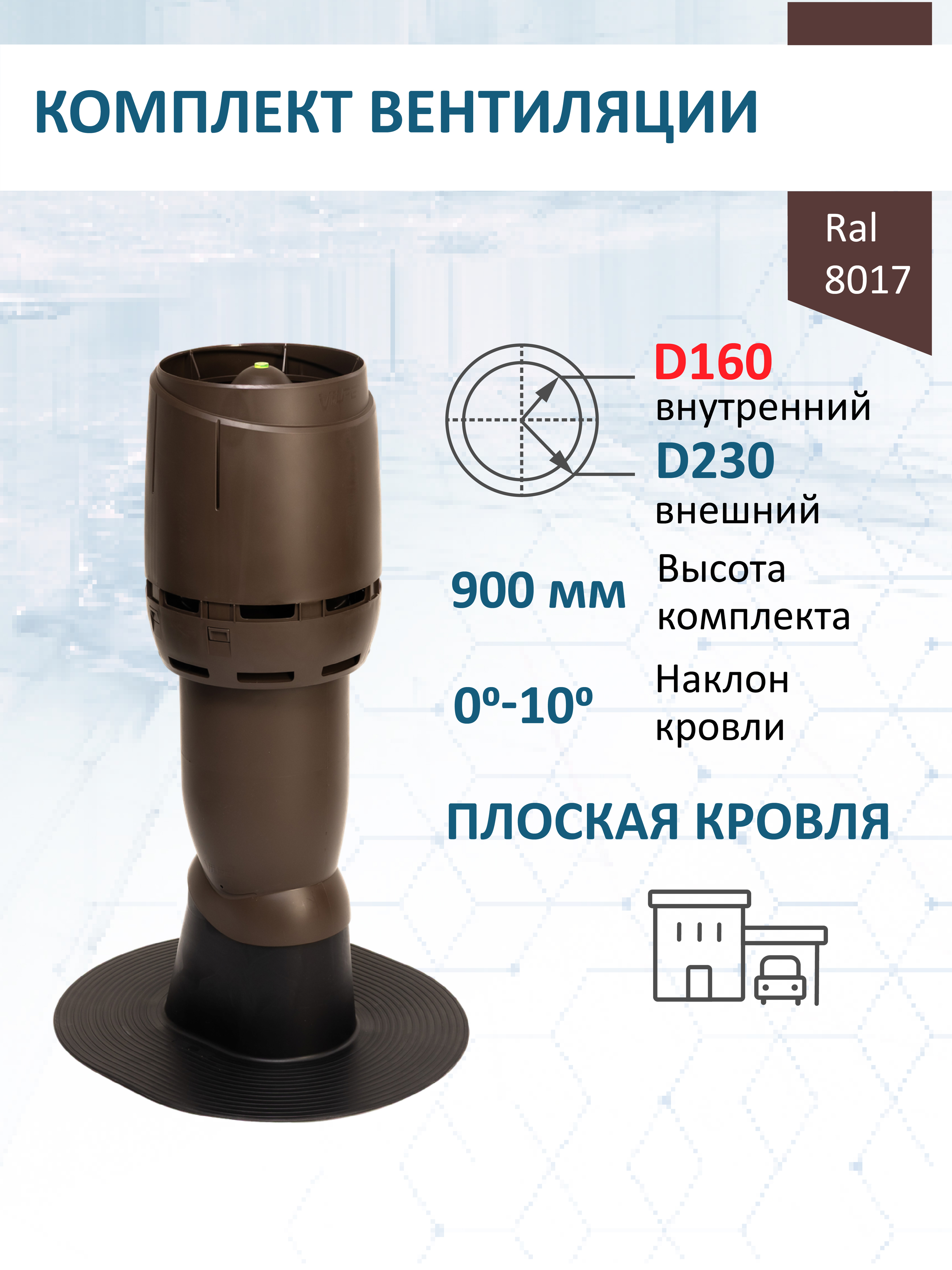 Комплект вентиляции: Вентиляционный выход изолированный Vilpe D160/225 утепленный высота H=500 мм, проходной элемент для плоской кровли ТП-187, колпак Ø 230 мм, коричневый - служит для создания вытяжки в вентиляционном канале частного или многоквартирного дома, в погребе, гараже, курятнике, коровнике, конюшне, предбаннике, в парилке бани, внешней вентиляции септика и складских помещениях.