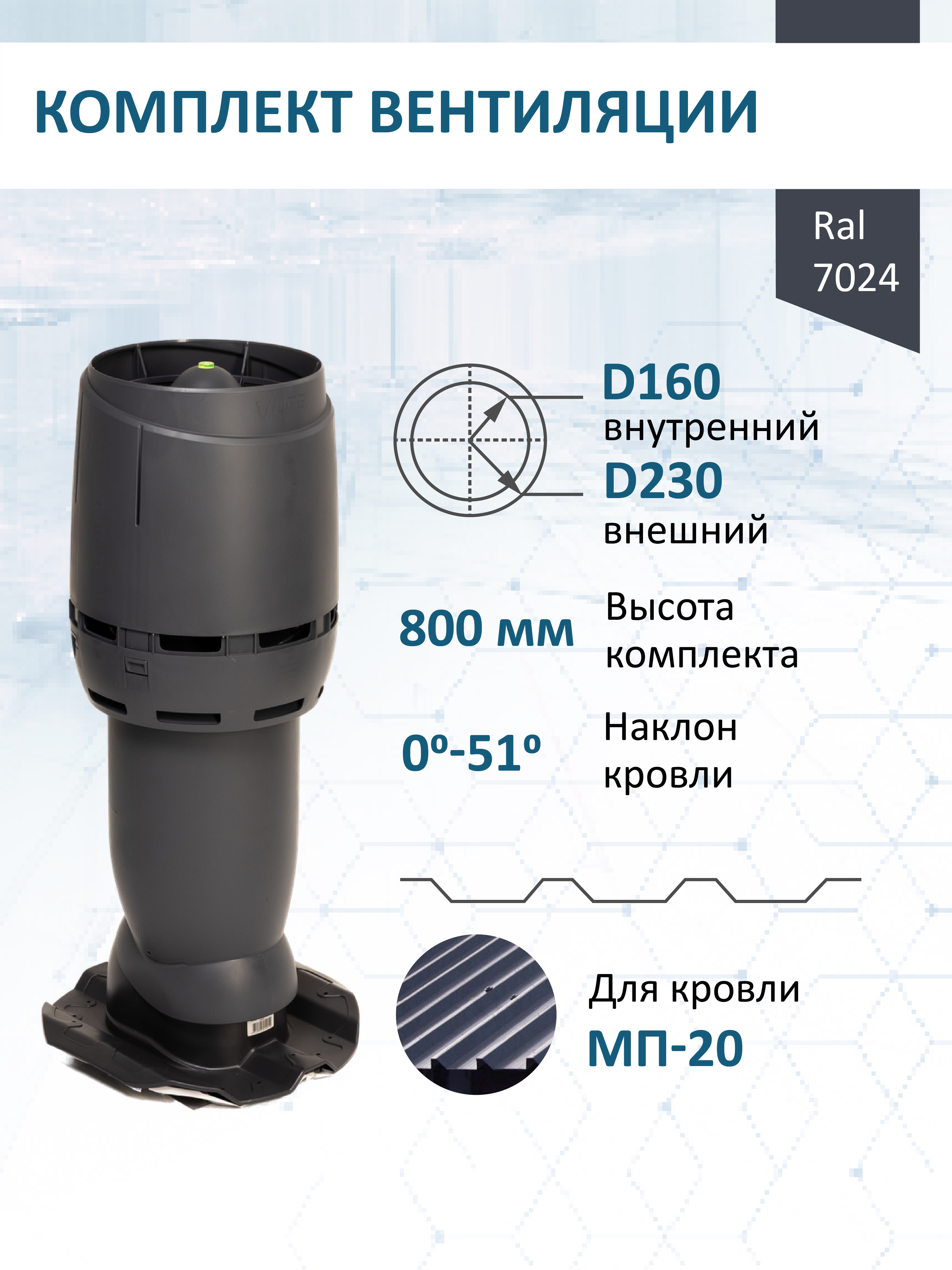 Комплект вентиляции: Вентиляционный выход изолированный Vilpe D160/225 утепленный высота H=500 мм, проходной элемент PROF-20 для металлопрофиля кровельного профнастила МП20 иС20, колпак Ø 230 мм, серый графит - служит для создания вытяжки в вентиляционном канале частного или многоквартирного дома, в погребе, гараже, курятнике, коровнике, конюшне, предбаннике, в парилке бани, внешней вентиляции септика и складских помещениях.