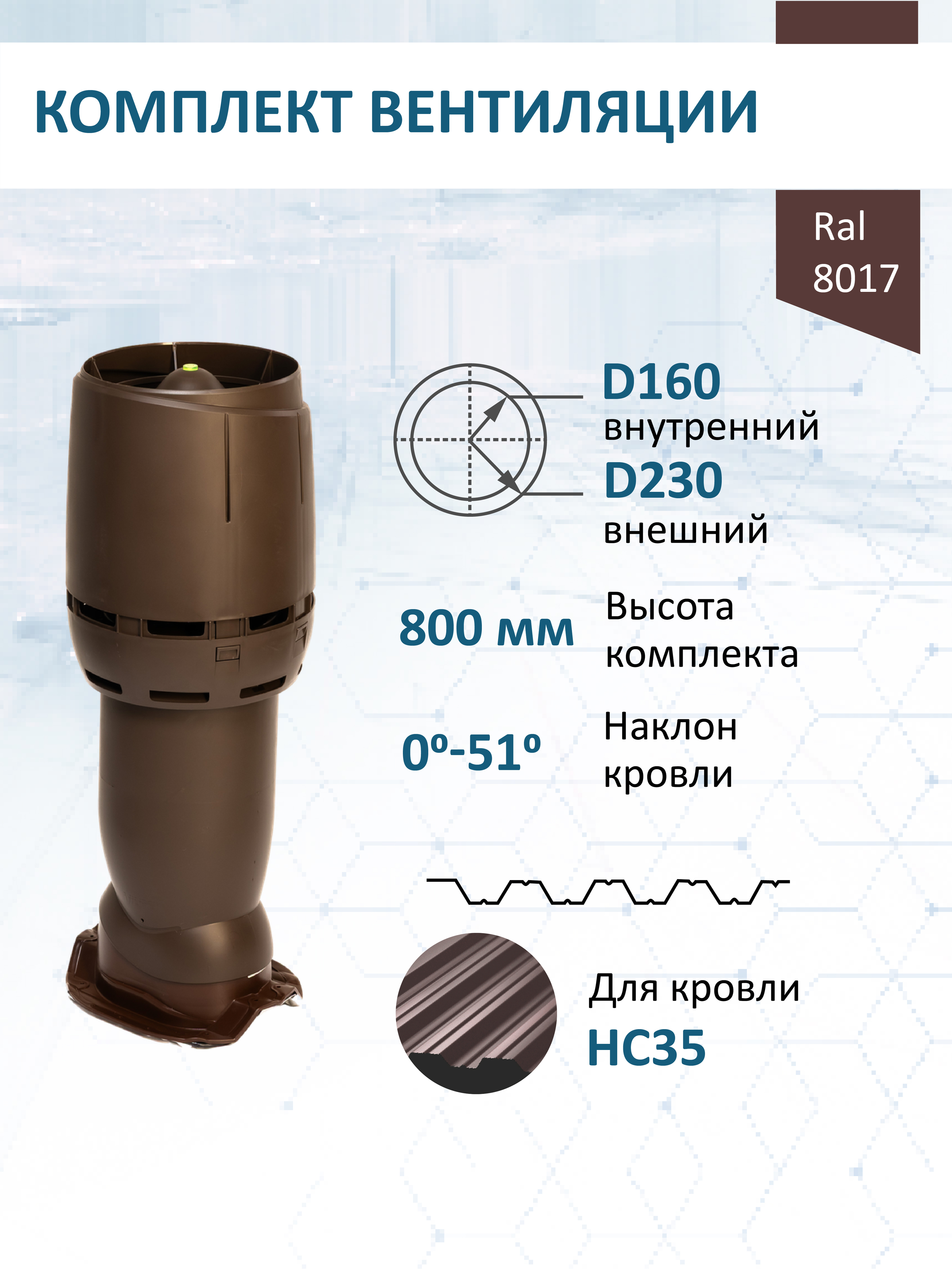 Комплект вентиляции: Вентиляционный выход изолированный Vilpe D160/225 утепленный высота H=500 мм, проходной элемент PROF-35 для металлопрофиля кровельного профнастила 35мм, колпак Ø 230 мм, коричневый - служит для создания вытяжки в вентиляционном канале частного или многоквартирного дома, в погребе, гараже, курятнике, коровнике, конюшне, предбаннике, в парилке бани, внешней вентиляции септика и складских помещениях.