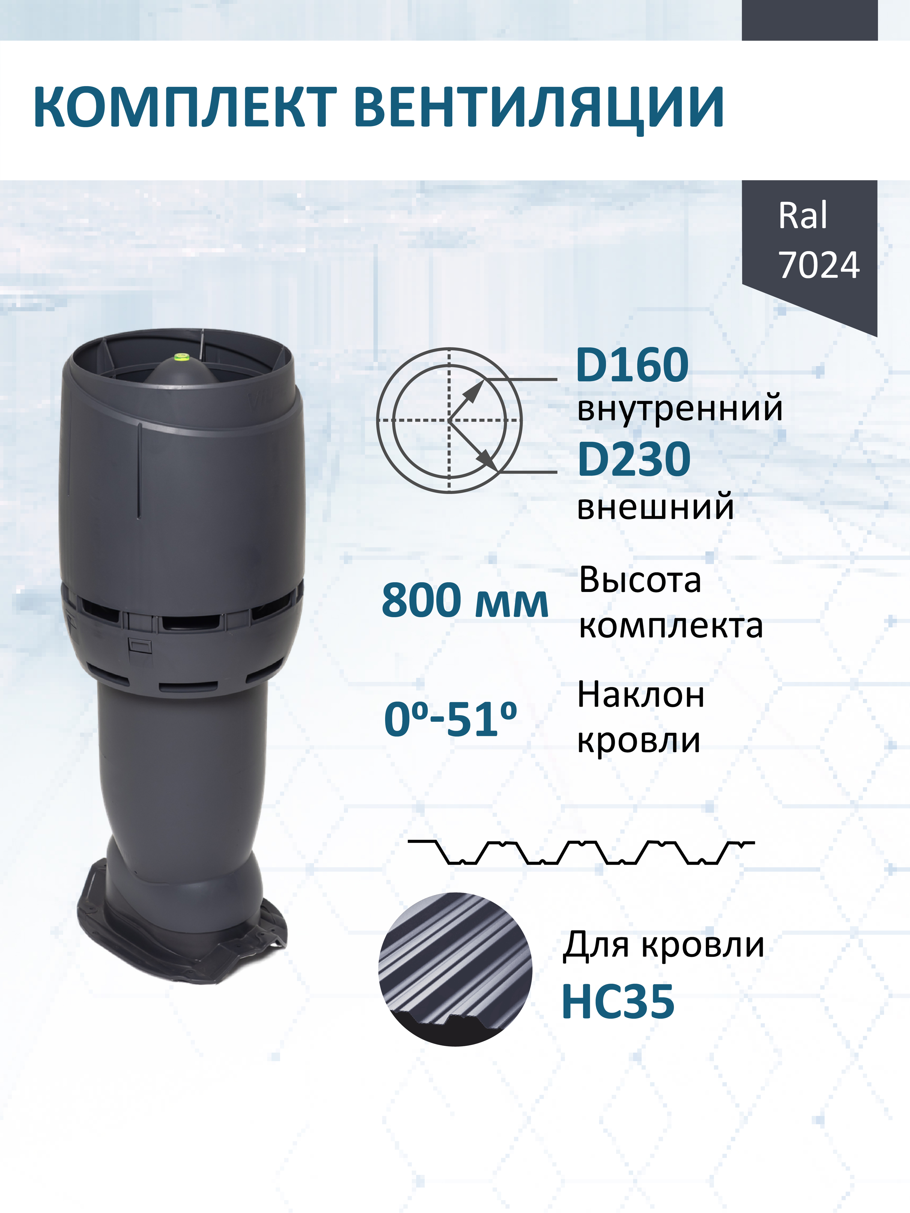 Комплект вентиляции: Вентиляционный выход изолированный Vilpe D160/225 утепленный высота H=500 мм, проходной элемент PROF-35 для металлопрофиля кровельного профнастила 35мм, колпак Ø 230 мм, серый графит - служит для создания вытяжки в вентиляционном канале частного или многоквартирного дома, в погребе, гараже, курятнике, коровнике, конюшне, предбаннике, в парилке бани, внешней вентиляции септика и складских помещениях.