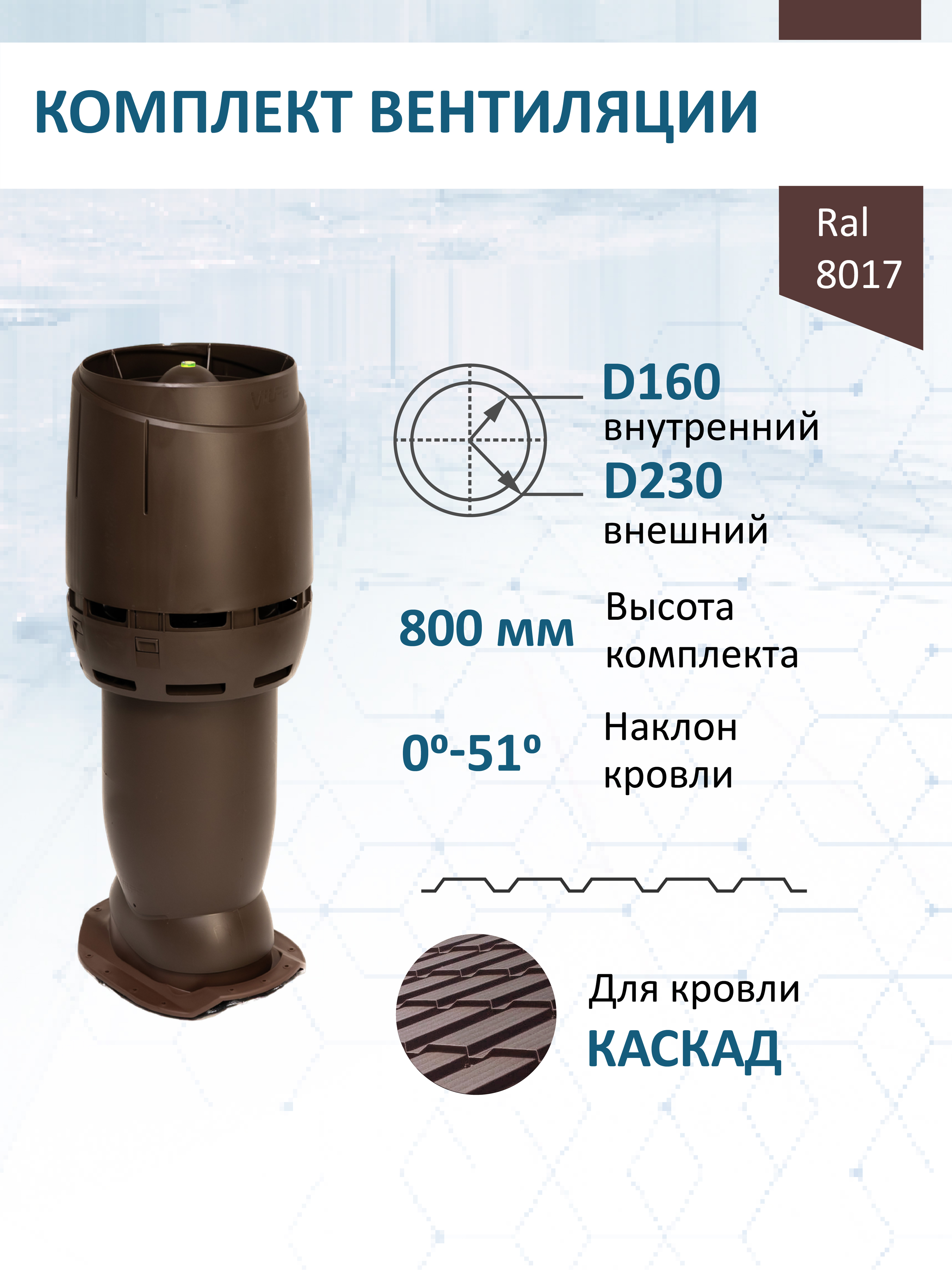 Комплект вентиляции: Вентиляционный выход изолированный Vilpe D160/225 утепленный высота H=500 мм, проходной элемент ТР-87/К для металлочерепицы Каскад, колпак Ø 230 мм, коричневый - используется для вывода на кровлю трубы вытяжной вентиляции.