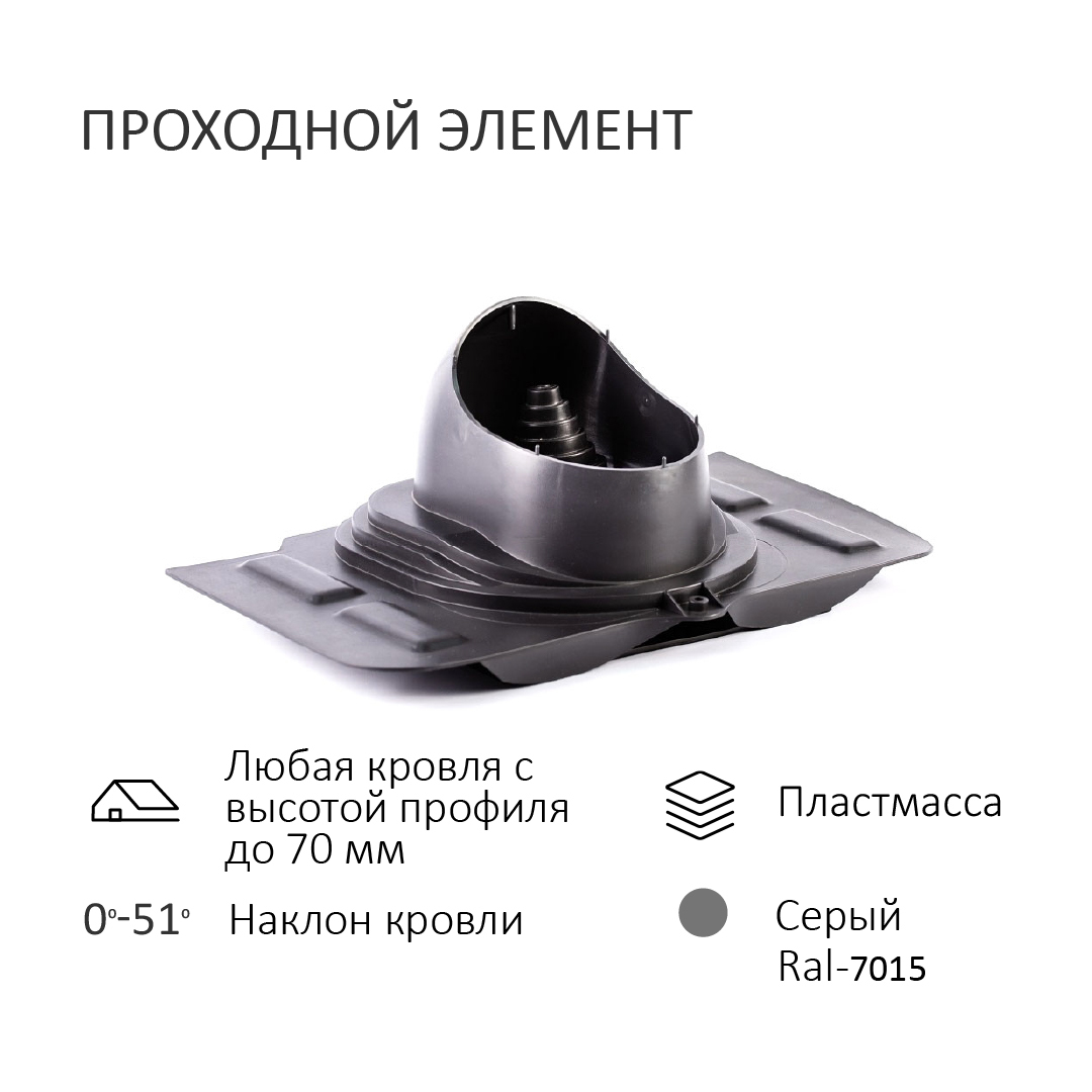 U - Проходной элемент UNIVERSAL применяется на кровлях из металлочерепицы или на других типах покрытия скатных кровель с любым типом профиля с высотой до 70 мм (в том числе и натуральная черепица при использовании сверла по стеклу и керамике, и саморезов для кирпича) для установки вентиляционных труб.
