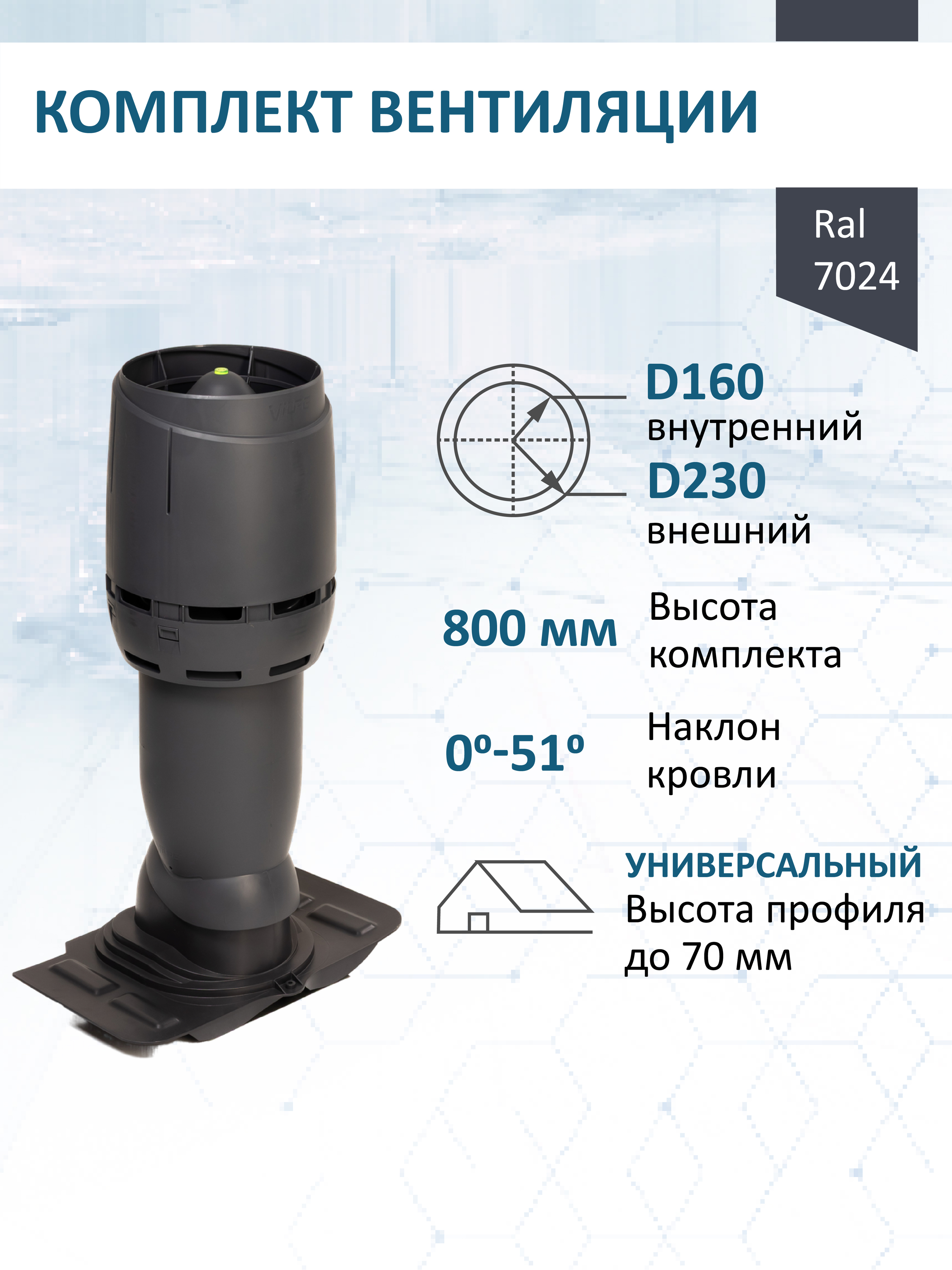 Комплект вентиляции: Вентиляционный выход изолированный Vilpe D160/225 утепленный высота H=500 мм, проходной элемент универсальный кровельный (Universal), колпак Ø 230 мм, серый графит - служит для создания вытяжки в вентиляционном канале частного или многоквартирного дома, в погребе, гараже, курятнике, коровнике, конюшне, предбаннике, в парилке бани, внешней вентиляции септика и складских помещениях.